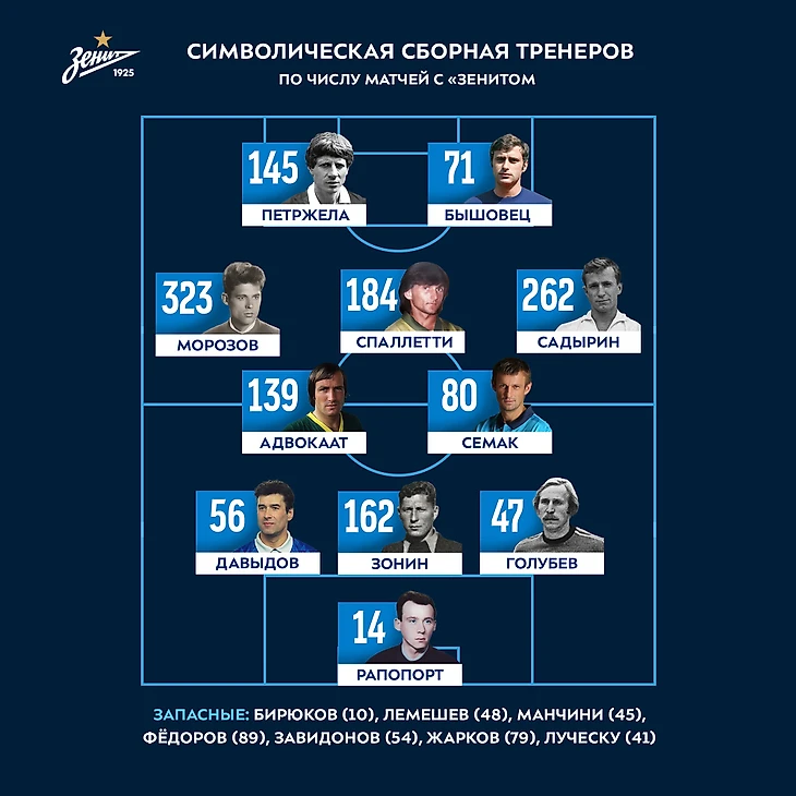 В апреле скучающая от паузы пресс-служба «Зенита» грешила составлением разнообразных символических сборных. Например, в День космонавтики мы увидели в клубном Твиттере «сборную Юриев». Но больше других запомнилась символическая команда, составленная из тренеров «Зенита» разных лет, размещенных на позициях, на которых они выступали в игроцкие годы. Решающим показателем для попадания в основу были не футбольные достижения как таковые, а количество игр во главе питерского клуба. Поэтому, например, звездный Манчини – двукратный чемпион Италии и бронзовый призер ЧМ-90 – остался в запасе со скромными 45 матчами. Зато основу украшало имя Властимила Петржелы, в игроцкие годы скромного форварда безвестных чешских команд, всего дважды надевавшего футболку сборной.
