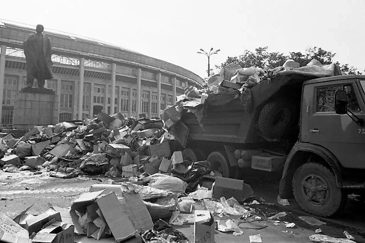 3. В перестройку для стадиона настали тяжелые времена. Спортивный комплекс находился в тяжелом финансовом положении. В 1992 году директор спорткомплекса попросил мэра города Лужкова Ю.М. выделить денег на реконструкцию, на что мэр предложил создать на территории "Лужников" вещевой рынок, который просуществовал в общей сложности 19 лет и окончательно был закрыт лишь в 2011 году.