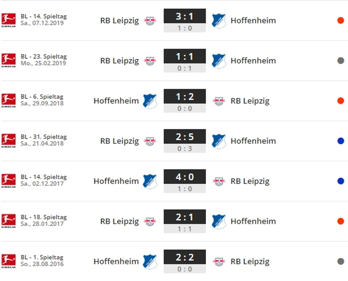 Гарантия гола: в восьми матчах между «Хоффенхаймом» и «РБ Лейпцигом» (семь в Бундеслиге и один в Кубке Германии) было забито колоссальные 29 голов (в среднем почти по четыре за игру), по крайней мере два мяча в каждой встрече.