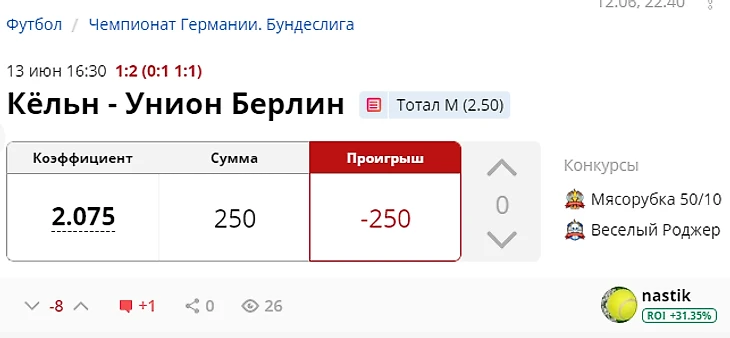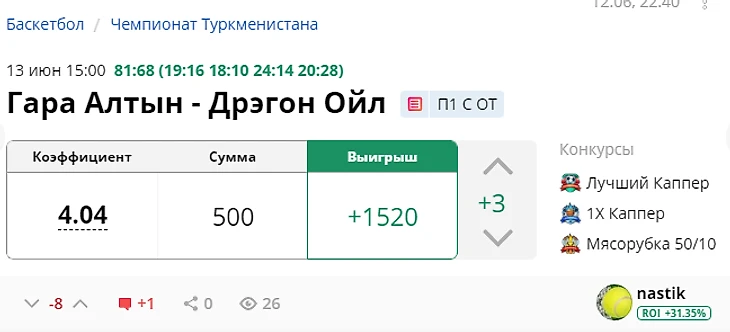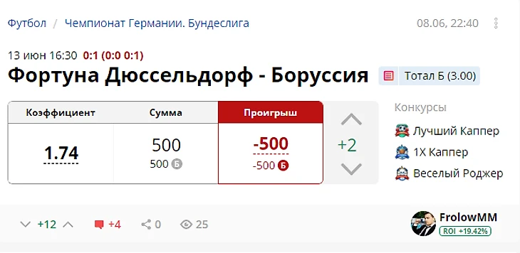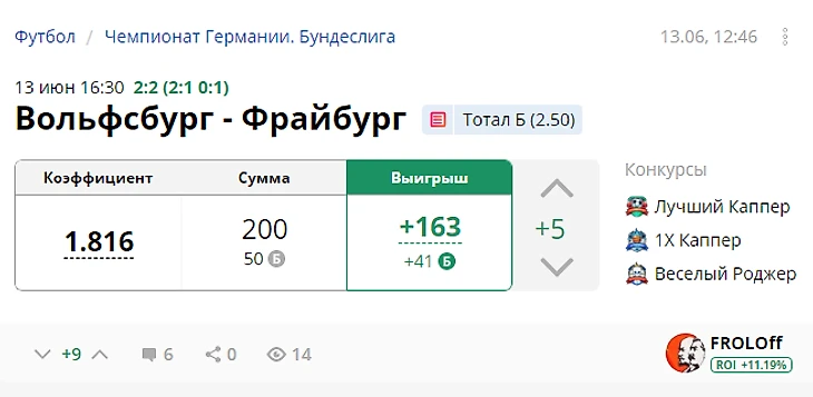 Результат с учетом ставок капперов: +2308 рублей (ROI 104,9)