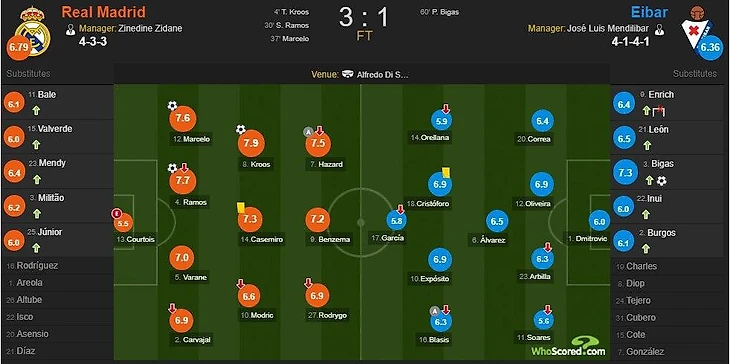 «Реал» уверенно вынес «Эйбар» на «Альфредо Ди Стефано» и приблизился к Барсе на расстояние двух очков. Интересно, что сегодня мы обошлись без голов наших форвардов - забивали Кроос, Рамос и Марсело. Первых двух портал WhoScored признал лучшими в составе «Мадрида».