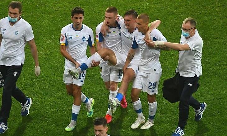 Судья не назначил пенальти в первом тайме за игру рукой Дениса Попова в собственной штрафной площади? Так сколько видео повтор потом не показывали, так и не ясно, сыграл ли Попов рукой, или нет? Даже не так. Не ясно, попал ли мяч в руку, или просвистел мимо? Хорошо видно, что Попов пытался отбить мяч головой, но не удачно, круглый черкнул о плечо защитника, и оказался в руках Георгия Бущана. Так что, на мой взгляд, VARовцы, сообщающие арбитру о спорных моментах после их видео повторов, поступили верно, что не стали заострять на этом эпизоде внимание. Как и в случае жесткого подката Томаша Кендзеры против Богдана Михайличенко, когда сообщение арбитру пошло. И только факт того, что бутса поляка сначала коснулась мяча, а потом ноги соперника, спасла киевское «Динамо» от игры в меньшинстве. Удаление хорвата Ловро Цвека тоже было справедливым. Сергея Сидорчука после стыка с ним товарищи по команде на руках унесли с поля. Как раз на заглавном фото.
