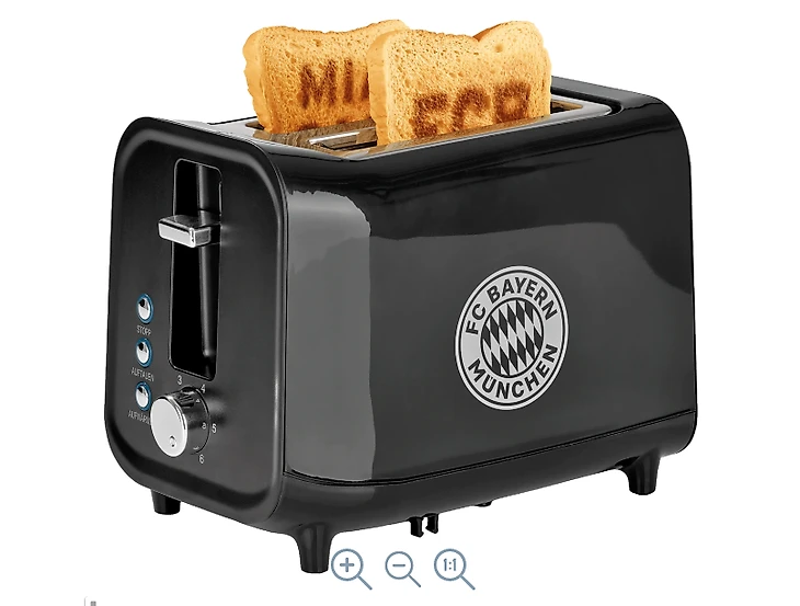 Во время поджаривания одна сторона получает фирменный логотип клуба, а другая – клубный девиз «Mia san mia». Так как это звуковой тостер, то по готовности начнет играть клубный гимн.