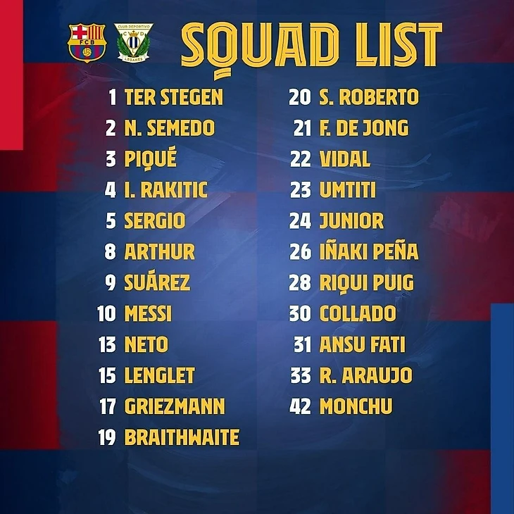 «Барселона» объявила заявку на матч с «Леганесом». Сейчас у блауграны травмирован только Усман Дембеле. Жорди Альба получил пятую желтую карточку и пропустит встречу из-за дисквалификации.