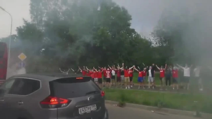 Другая группа болельщиков встречала клубный автобус на въезде в Тулу. Тоже с файерами.