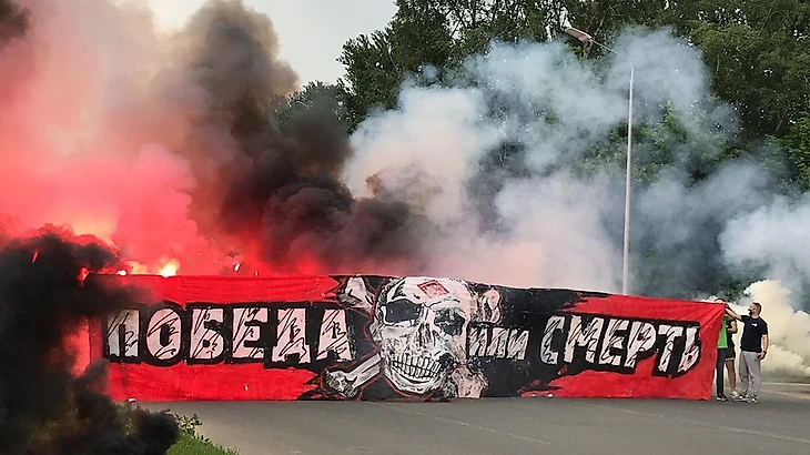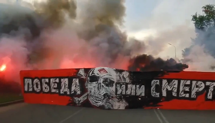 Несколько десятков человек выбежали на дорогу около «Открытие Арены», растянули баннер «Победа или смерть» и зажгли дымовые шашки и файеры. Все это под заряды про «Спартак».
