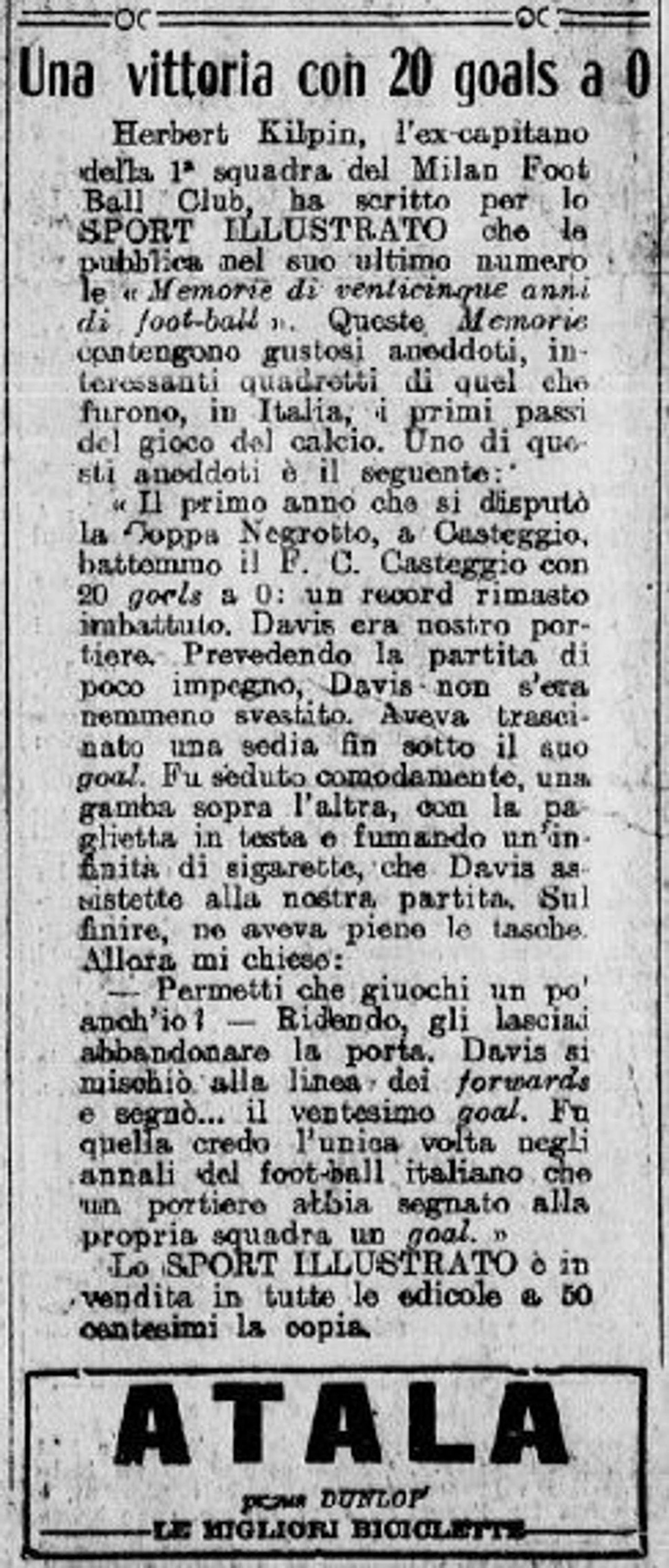 "В первый год проведения Кубка Негротто мы победили футбольный клуб "Кастеджо" со счетом 20:0. Нашим вратарем был Дэвис. Ожидая легкой игры, он даже не стал переодеваться. В один момент он притащил к своим воротам табуретку. Он удобно сел, скрестив ноги, надел соломенную шляпу на голову, и выкурил бесчисленное количество сигарет. После матча его карманы были заполнены [окурками].
