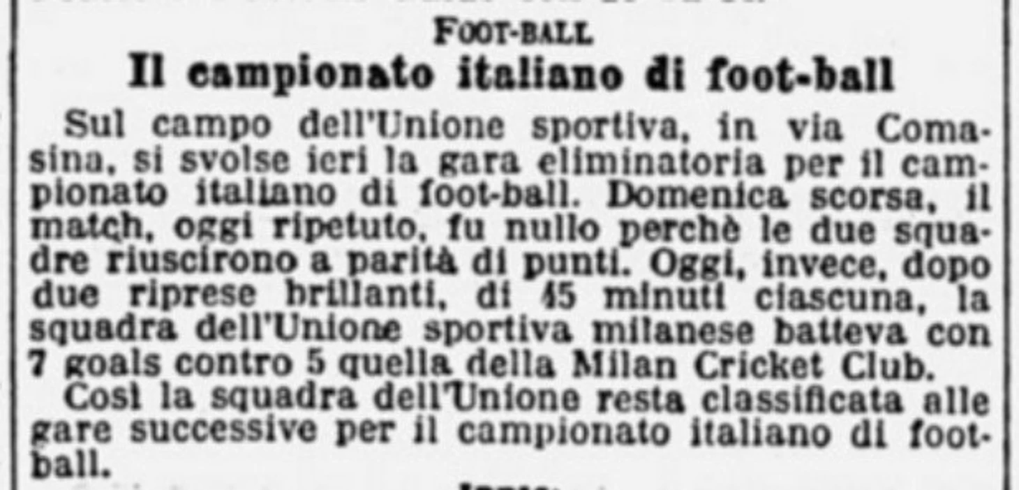 "Сегодня, после двух блестящих таймов по 45 минут, "С.С. Миланезе" забил 7 голов против 5 голов "Миланского Крикетного Клуба" (прим. тогдашнее название "Милана"). Команда "Миланезе" остается в турнире для следующего этапа итальянского чемпионата".