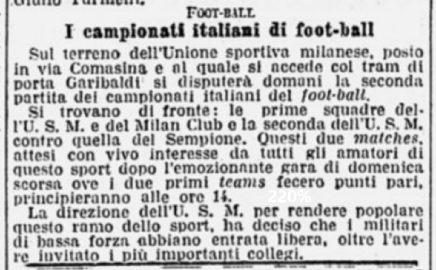 Сверху представлена вырезка из газеты Corriere della Sera с афишей ответного матча миланских коллективов. "Завтра состоится вторая игра итальянского чемпионата по футболу между "С.С. Миланезе" и "Миланом". Она пройдет на территории "Спортивного Союза Миланезе", располагающегося на улице Комасина, в 14:00. "С.С. Миланезе", чтобы сделать этот спорт популярнее, решил, что военные рядового состава получат свободный доступ. Также были приглашены студенты различных колледжей", - говорилось в заявлении издания.