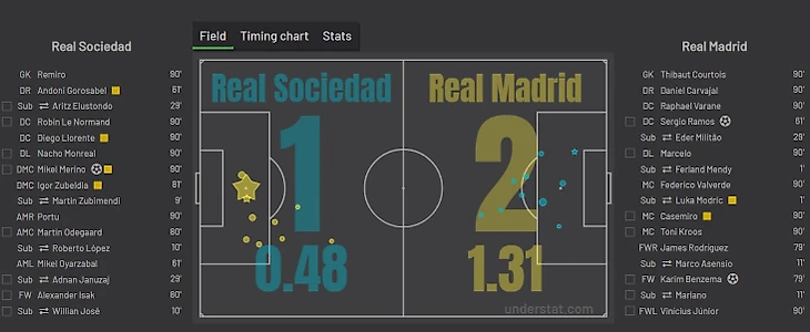 "Реал Мадрид" в очередной раз сыграл два разных тайма, но виден отчетливый прогресс команды. Они стали лучше контролировать игру и разыгрывать позиционные атаки. Несмотря на равные статистические показатели, подопечные Зидана наиграли на показатель ожидаемых голов в 1,31 и в целом выглядели лучше.