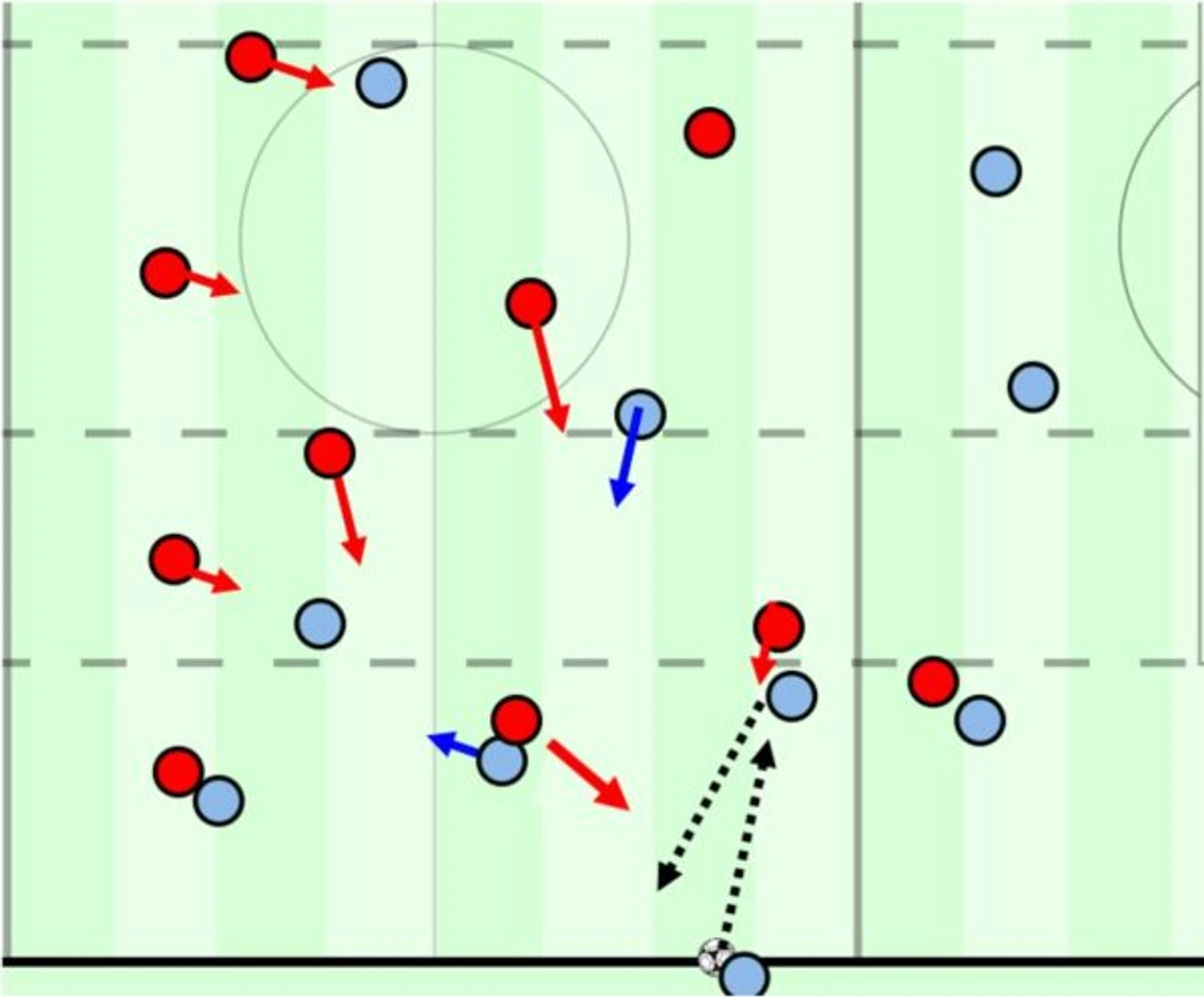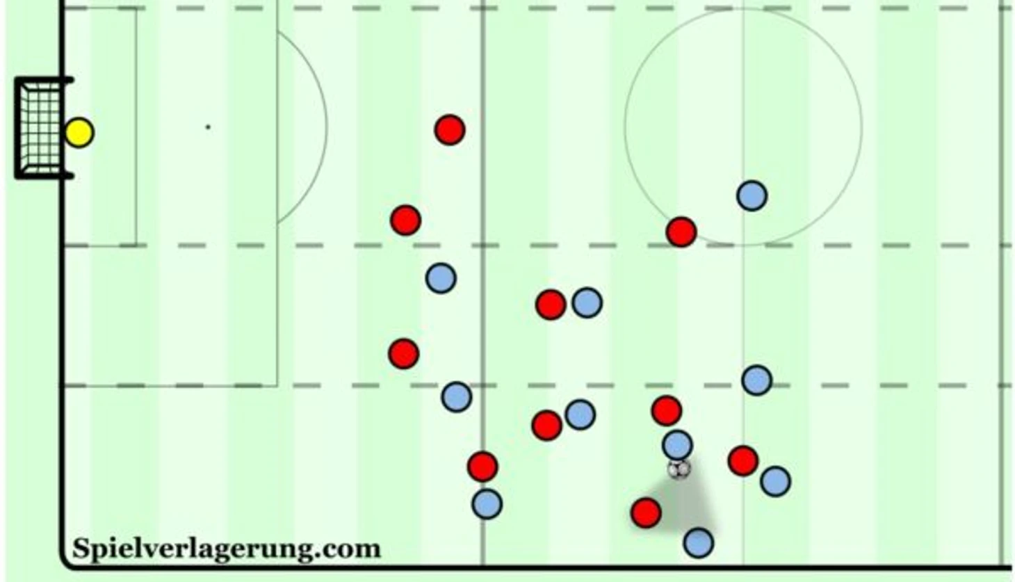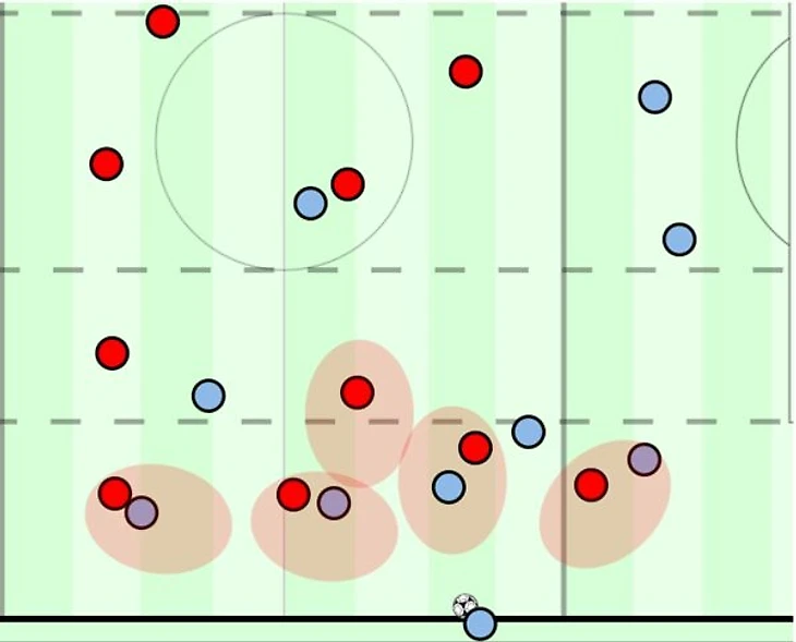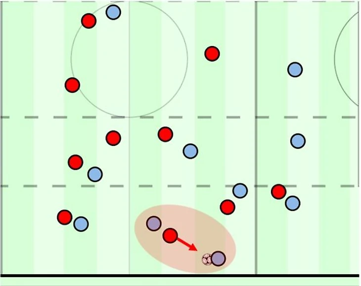 Обычно все обороняющиеся прекрасно понимают расположение оппонентов, но рывки в слепых зонах, и создание численного преимущества в них же, приводят к проблемам. Хотя многие скажут, что чаще всего в такой ситуации мы увидим розыгрыш в одну-две передачи и последующий кросс в штрафную или перевод мяча в менее нагруженную зону. И вы будете правы.