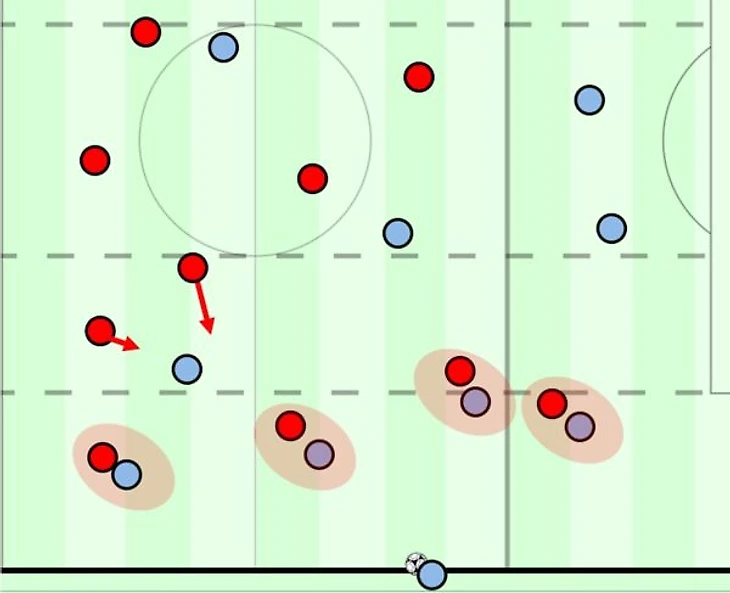 Следует использовать замаскированный вариант этой концепции, чтобы у соперника возникло желание разыгрывать мяч короткими-средними передачами. Очень похоже на прессинг-ловушки, если нам хочется продолжать эту аналогию.