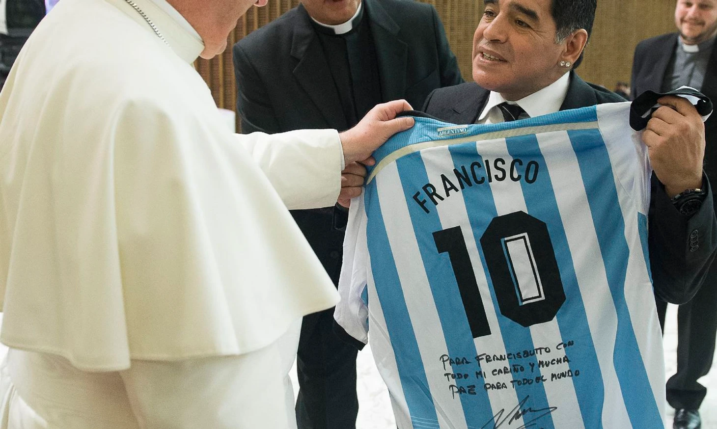 В 2014 аргентинец показал себя с лучшей стороны: он подарил Папе Римскому Франциску футболку с десятым номером. Прославленный футболист, который находился в числе 400 приглашенных на благотворительную игру, преподнес свой подарок понтифику перед «межрелигиозным матчем мира». Отмечается, что Марадона, дождавшись своей очереди поприветствовать Папу Римского, дольше остальных общался с Франциском. Возможно, отношения Диего Армандо изменились к главе католической церкви из-за того, что с 2013 года этот пост занимает соотечественник Марадоны. Папа Римский болеет за "Сан-Лоренсо". Он является самым известным фанатом клуба из Южной Америки.