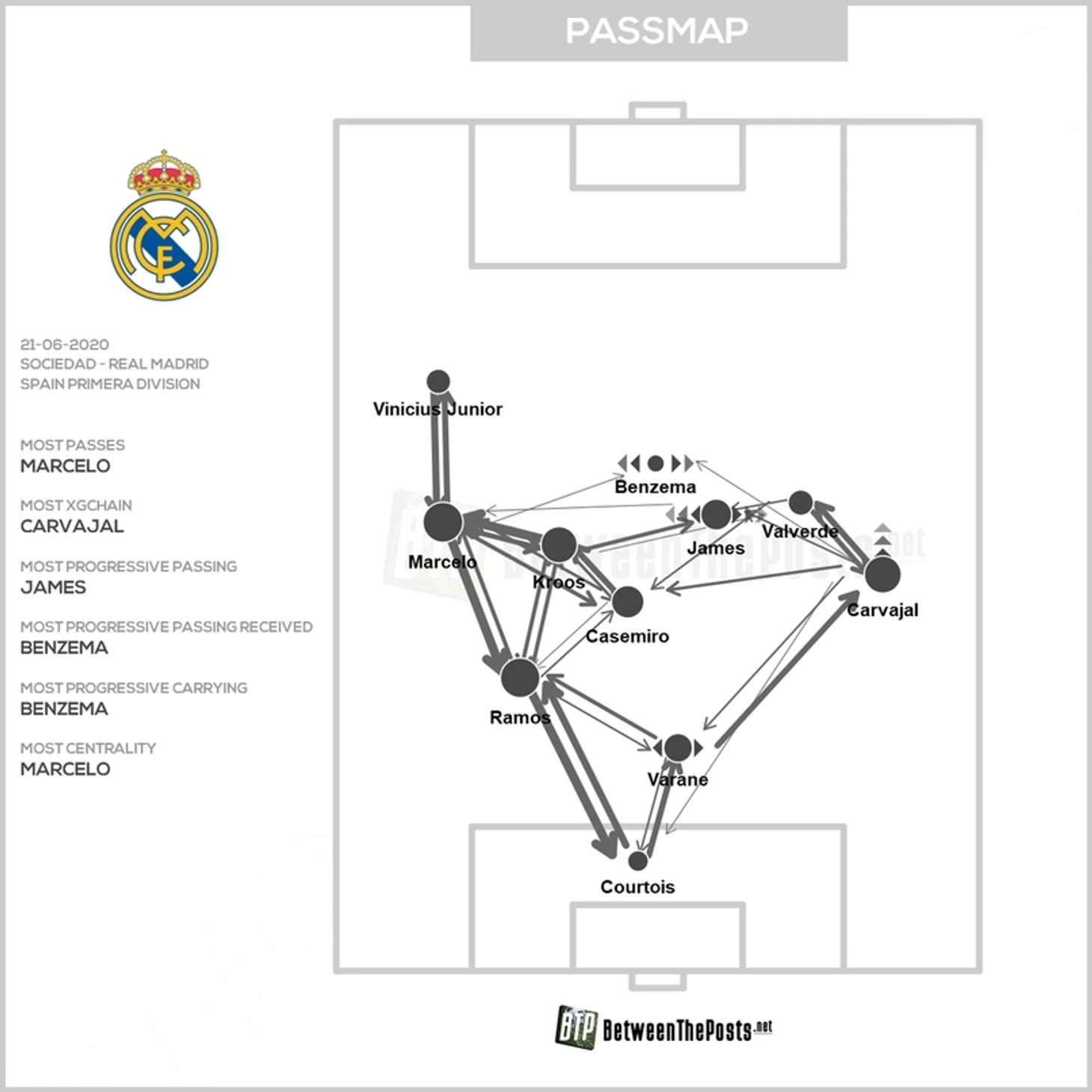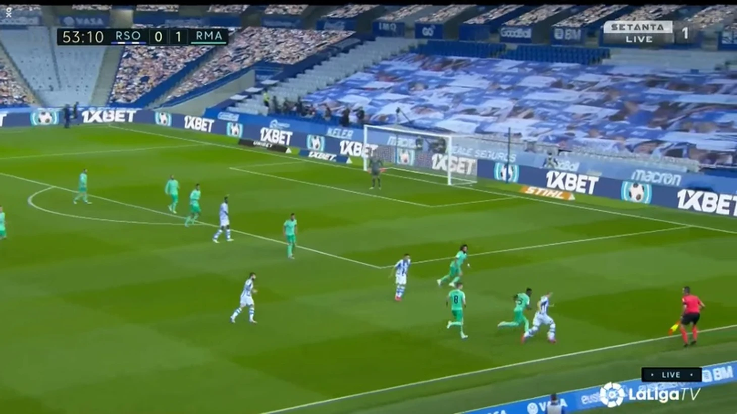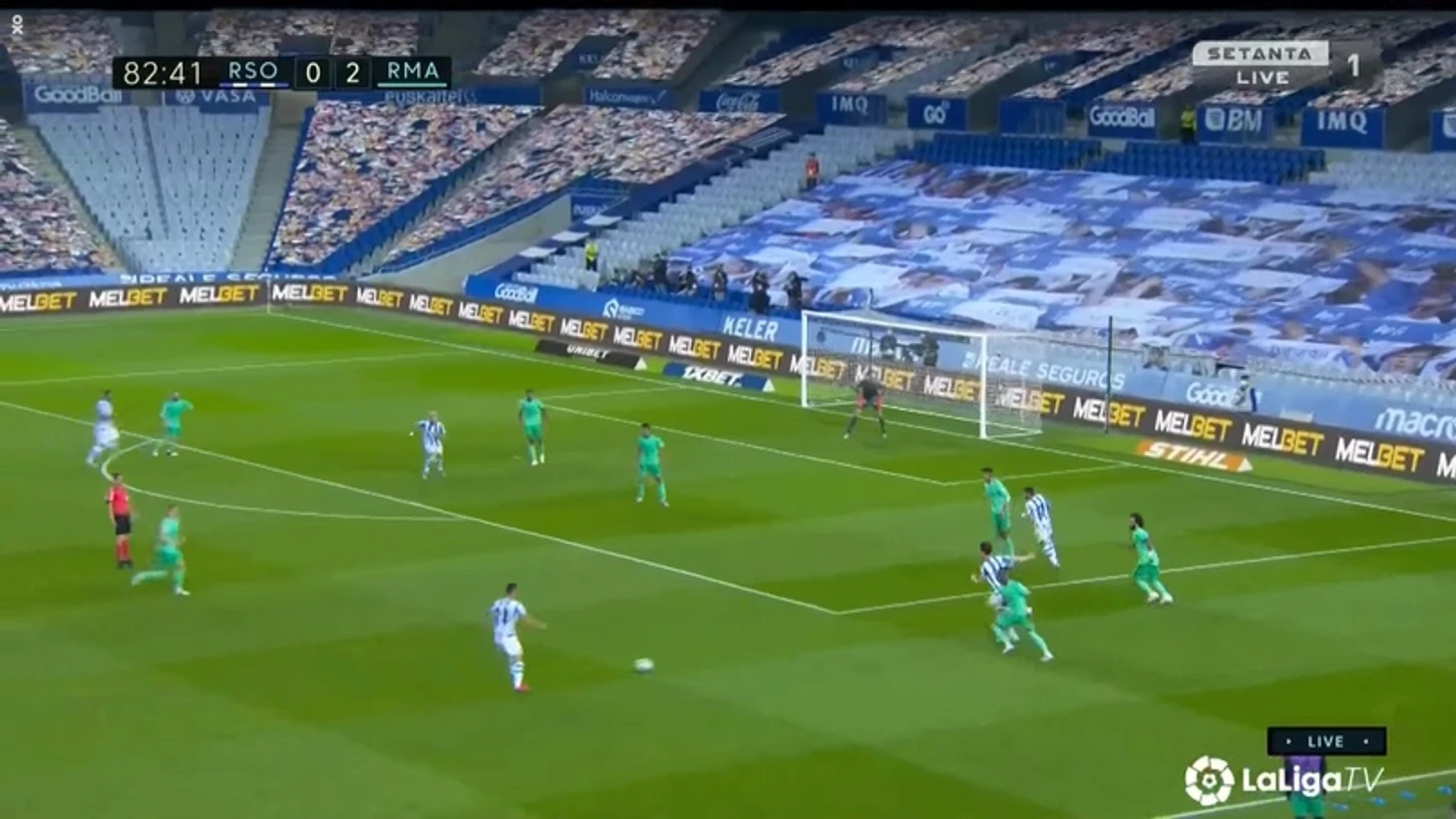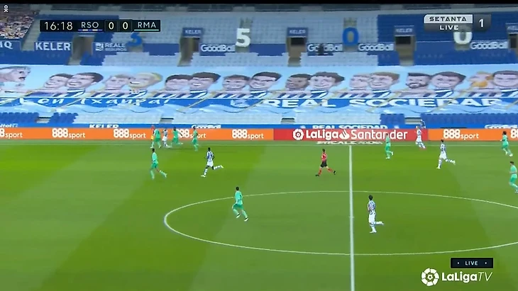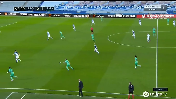 Карвахаль и Марсело бросили фланг и сместились в опорную зону, чтобы выйти из под натиска «Сосьедада». В данном эпизоде этот выход из обороны привел снова к Винисиусу, который практически вышел 1 на 1 с кипером, но, как обычно, последнее действие совершил неудачно.