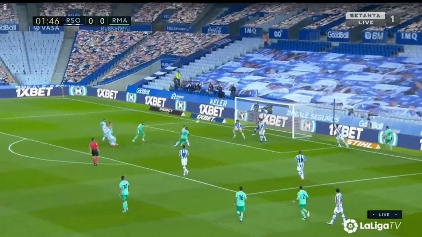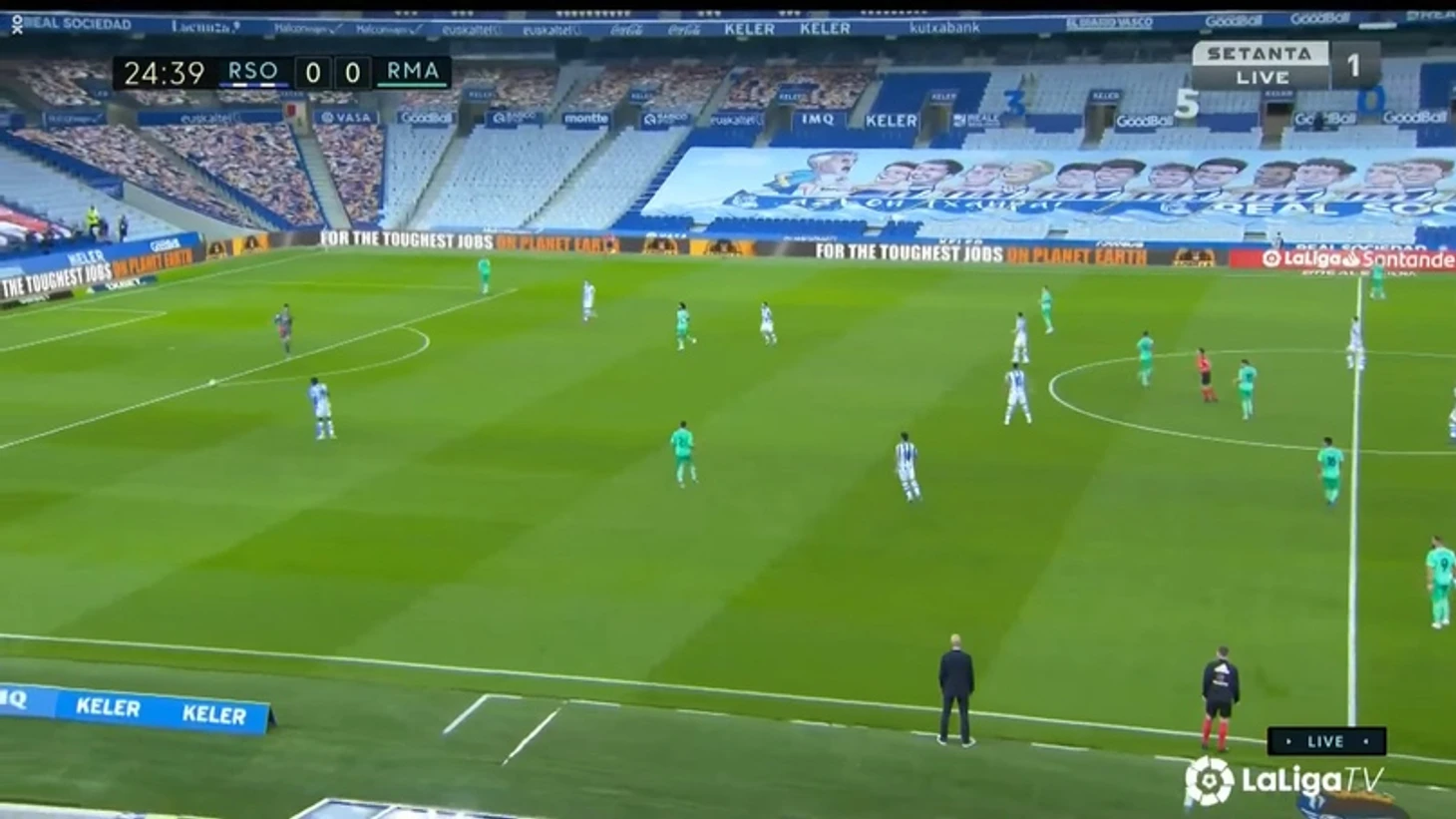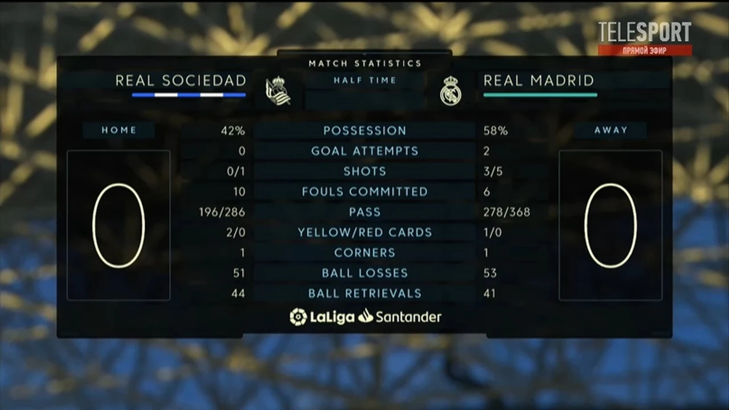 В первом тайме игра смотрелась очень вяло, ведь действительно опасных моментов не было у гостей, который владели мячом, не говоря уже о басках. У «Мадрида» мог возникнуть опасный момент, но Феде Вальверде принял неправильное решение при выходе 3 в 3.