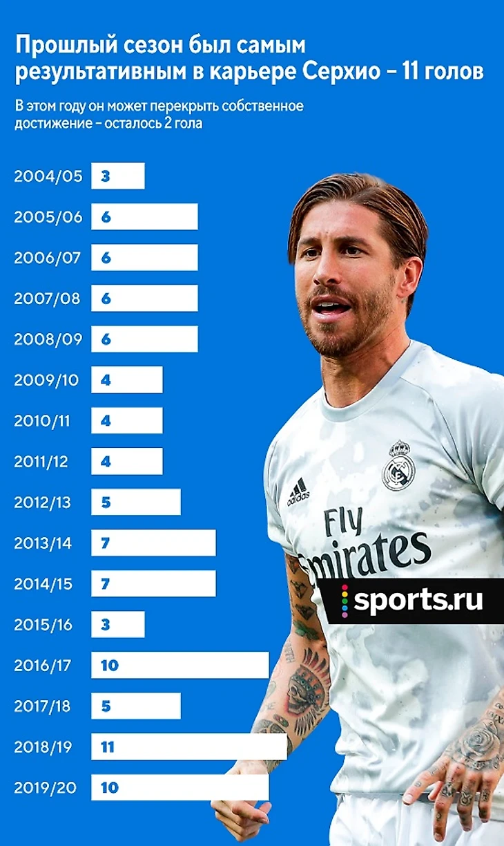 • 10 голов в Ла Лиге за сезон – рекорд для Серхио и лучший показатель для защитников за 14 лет (последним был Мариано Перния в сезоне-2005/06). В этом сезоне за «Реал» больше забил только Карим Бензема.