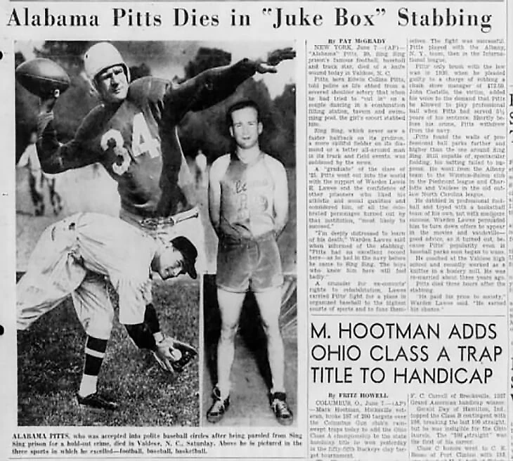 Главной звездой в составе футбольной сборной Синг-Синга был Эдвин Коллинз Питтс, который также играл в бейсбол и баскетбол. Он родился в Алабаме, и название родного штата стало тюремным прозвищем Питтса, с которым он позже ворвался в профессиональный спорт. «Алабама Питтс потерял отца в детстве, а в 15 лет будущий спортсмен был зачислен в военно-морской флот. После трех лет службы он оказался в Нью-Йорке, где не смог найти работу. Бывший сослуживец предложил ему ограбить продуктовый магазин, и Питтс, у которого не было денег даже на еду, согласился. Дело принесло ему всего 10 долларов, Алабаму поймали и назначили 8 лет лишения свободы в стенах Синг-Синга», – именно так в номере газеты Charlotte Observer от 18 июня 1935 года описывалось прошлое Питтса.