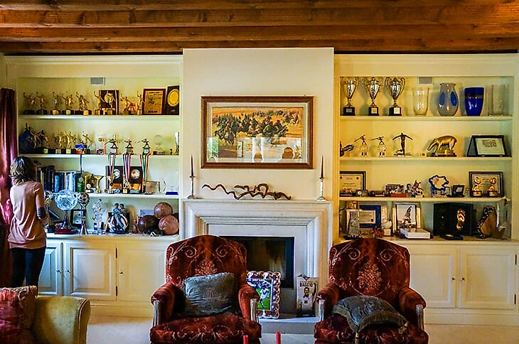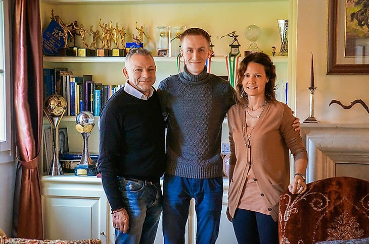 Нам провели экскурсию по дому, мы посмотрели комнату с наградами, в гостиной вручили Баджо матрешку с его изображением, их семья тоже подготовила для нас подарки – мяч Роберто с автографом. Его младшему сыну Леонардо я привез игрушку с символикой Олимпийских игр в Сочи – он трогательно уткнулся носом отцу в живот, а Роби сказал: «Что ж ты, Лео, надо сказать спасибо». Лео поблагодарил нас туда же в отцовский живот и помчался к себе в комнату, обняв игрушку.