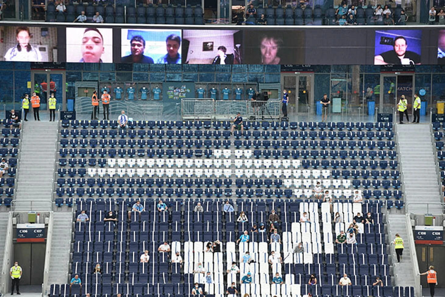 Клуб позаботился не только о владельцах абонементов, которые все-таки попали на стадион, но и о болельщиках, которые не смогли быть на матче. «Зенит» вместе с «Мегафоном» организовал digital-трибуну: фанаты могли подключиться к системе через Zoom и присутствовать на стадионе. Показали каждого болельщика.