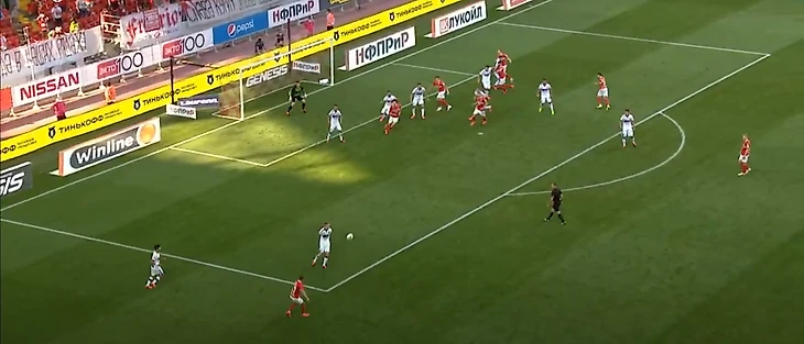 87-ая минута: Спартак разыгрывает угловой, Зобнин закидывает мяч в штрафную низом