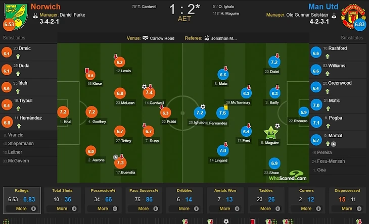 Традиционно потал Whoscored выставил оценки за матч четвертьфинала Кубка Англии между "Манчестер Юнайтед" и "Норвичем".