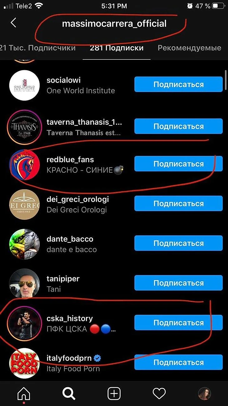 В частности, в подписках у итальянского специалиста на данный момент числятся redblue_fans и cska_history.