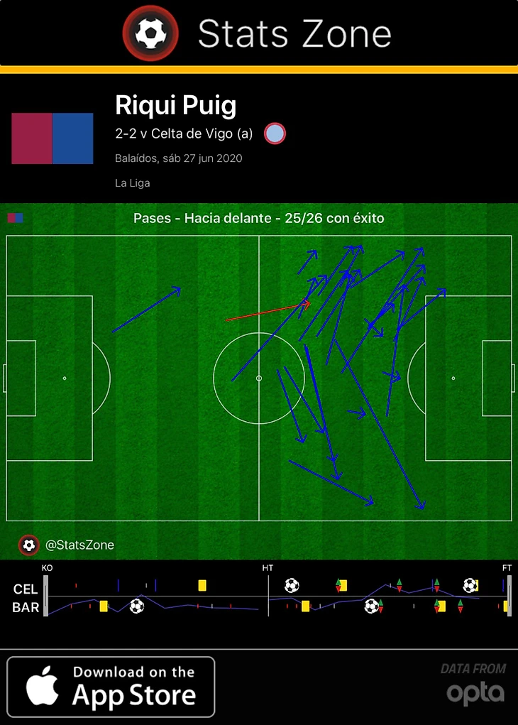 26 передач из 66 - это 39%. В полтора раза больше направленности на передачи вперед, чем у Артура в матче против «Севильи» (10/38=26%). Это не помешало одному из новорожденных на сайте персонажей ввалиться в мой ПЕРЕВОД статьи Дидака Пейрета и заявить, что Я не замечаю, что «90% пасов Пуча это назад, да поперек», что Рики ничего не контролировал. Особенно занятно было «сыграл бы так Артур или Ракитич, ты бы их уже поносил».