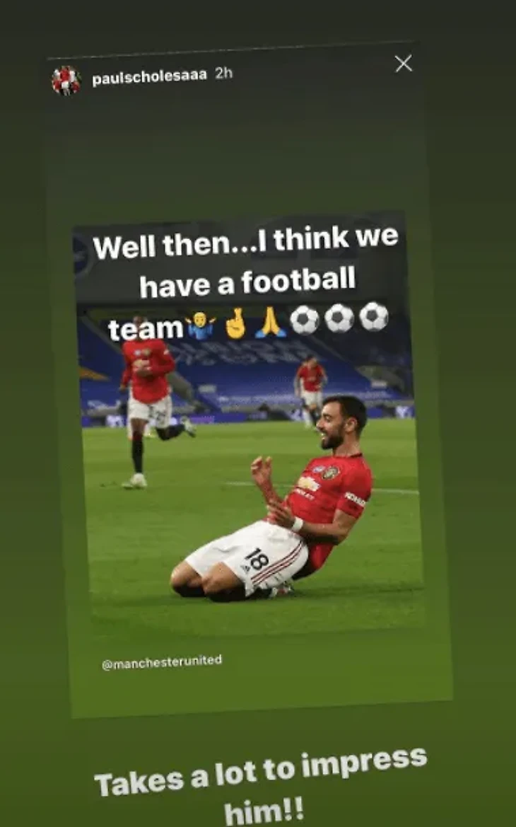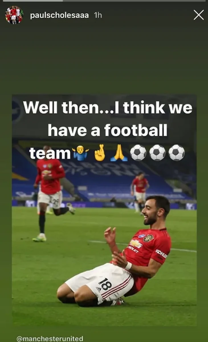 Приятный рекорд сопряжен и с отличной игрой в последних матчах чемпионата. Не отметить это не смог и легендарный Пол Скоулз. В своем Инстаграме Скоулзи опубликовал сториз с фото Бруну Фернандеша и подписью: «Ну, похоже, у нас есть [футбольная] команда».