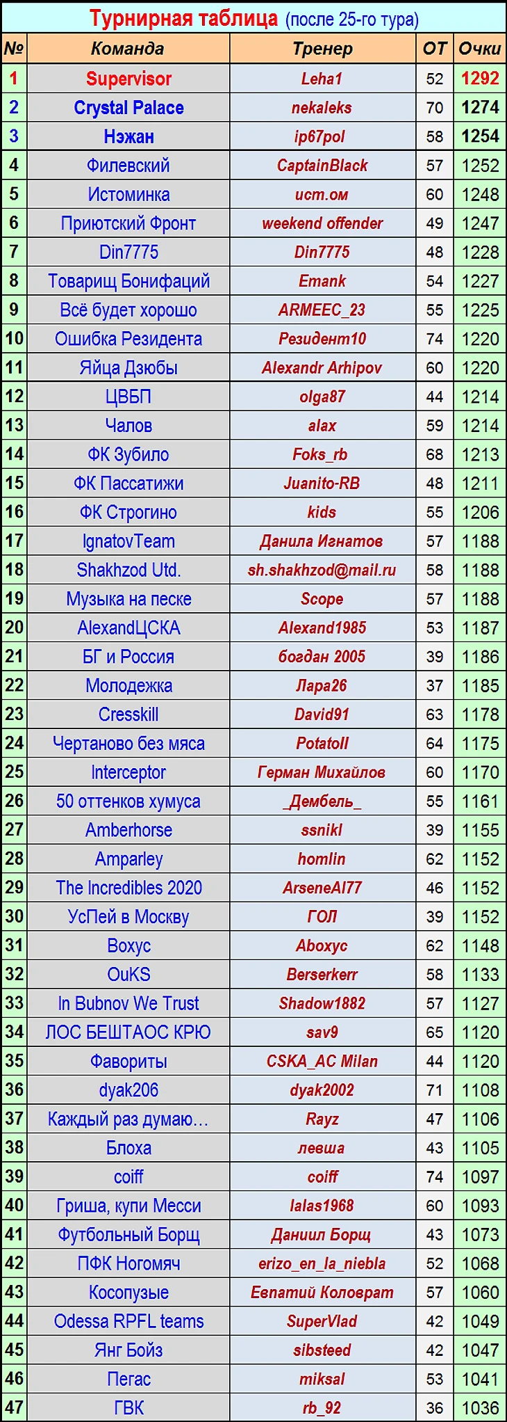 МВП 25 тура - команды "Ошибка Резидента" (тренер - Сергей Резидент10) и "coiff" (тренер - Николай coiff) - по 74 очка!