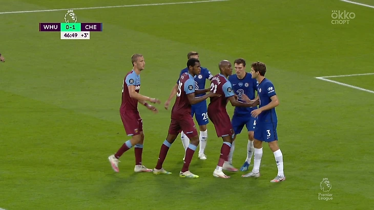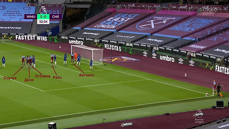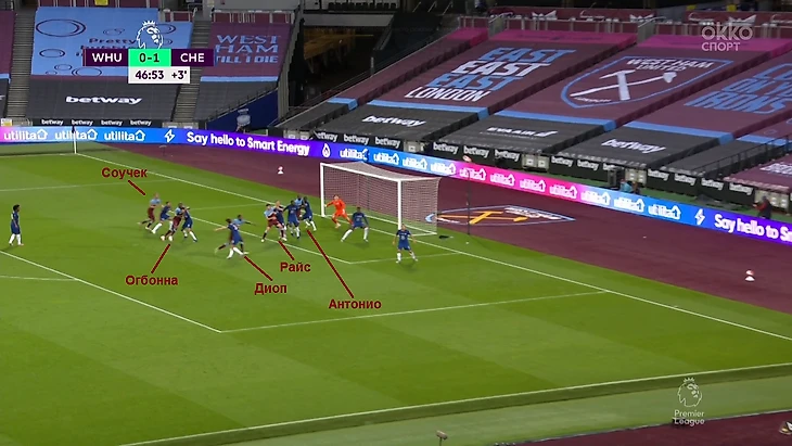 «Вест Хэм» разыгрывает угловой. В штрафной – блок 3-2. Антонио и Райс играют во вратарской, Соучек, Диоп и Огбонна – ниже, около 11-метровой. Их еще Аспиликуэта расталкивал пятой точкой.