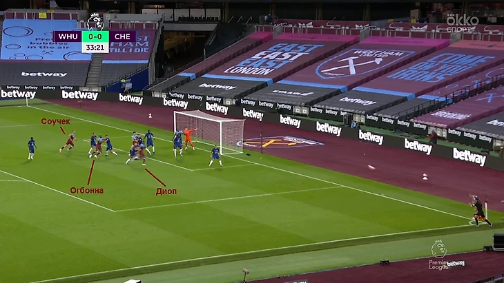 Тройка разбегается: Диоп летит на ближнюю, Соучек – на дальнюю, Огбонна остается в середине. Боуэн вешает на Диопа, тот смахивает на длину всех ворот – мяч прилетает к Соучеку.