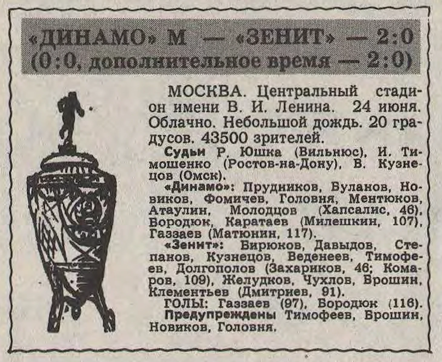 Назад в будущее. Эта победа станет последней в советской истории московского "Динамо". Еще один Кубок (но уже России) они завоюют в 1995 году.