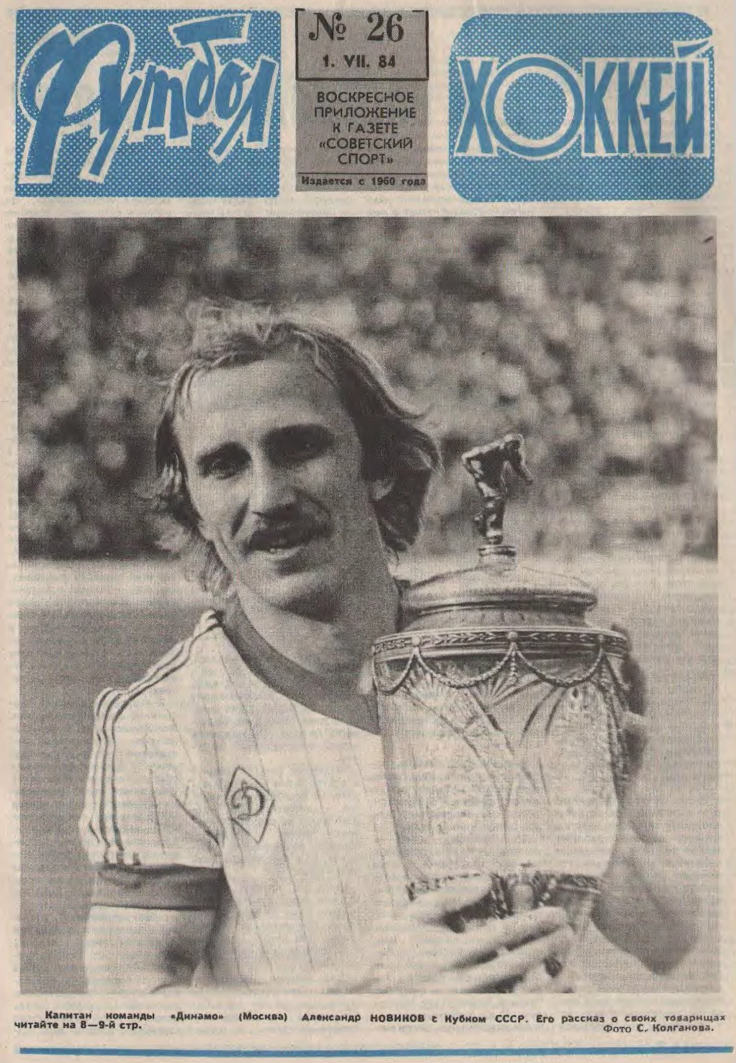 Номер 26 еженедельника "Футбол-Хоккей" в 1984 году посвящен двум основным темам. Предпочтение отдано, разумеется, местным событиям, поэтому на обложке довольный капитан московского "Динамо" Александр Новиков с Кубком СССР.