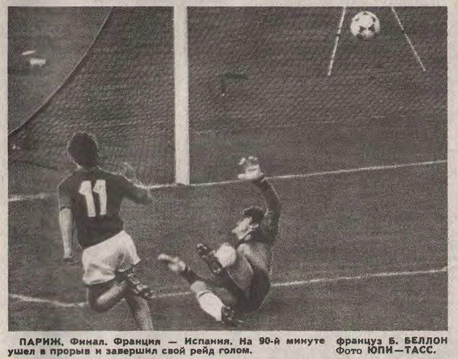 "Объективно говоря, на сегодняшний день "трехцветные" сильнейшие на континенте... Французская сборная, столкнувшись с "персоналкой", долго не могла перестроиться, хотя, конечно же играла и шире (используя фланги), и тактически слаженнее... Мяч после удара Платини прилетел к нему прямо в руки. Но затем произошло непоправимое: мяч выскользнул из рук испанского голкипера и еле-еле вкатился в ворота. Какая досадная ошибка!.. Как и на чемпионате мира в Испании никакого тактического переворота не произошло. Но большинство матчей, когда шла встречная бесстрашная, драматичная борьба за мяч, когда игроки все свое мастерство отдавали не только обороне, но и в первую очередь атаке, так и стоят перед глазами."