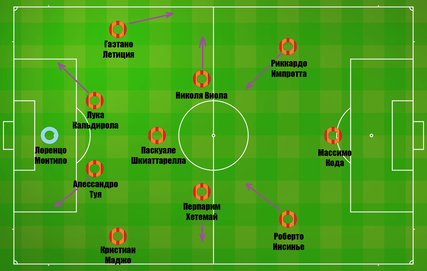 Основных схем у команды две — 4-3-2-1- и 4-3-3. Индзаги, впрочем, активно варьирует их, доходя даже до 5-3-2 ( все зависит от задач на матч) и активно ротируя состав. ЛЗ Летиция сыграл, к примеру, и справа в защите, а вся линия полузащиты активно меняется местами. Центральная ось — главная линия в команде, здесь дирижирует Виола при помощи Инсинье ( брат игрока « Наполи), Сау. В целом составы ниже, кроме обороны и ОПЗ, очень приблизительны, потому что у каждого несколько ролей: