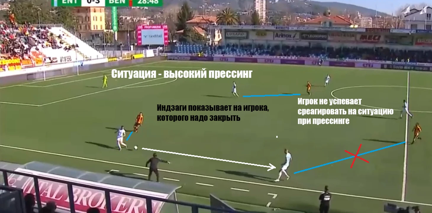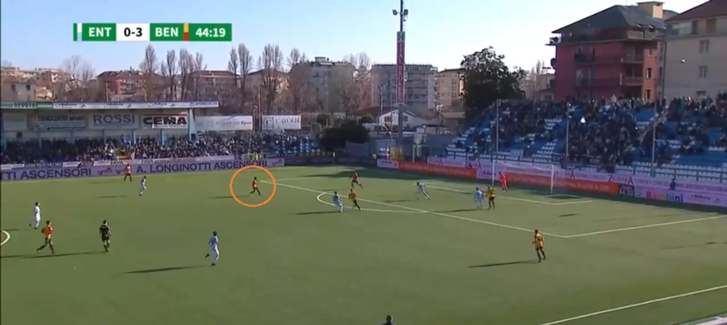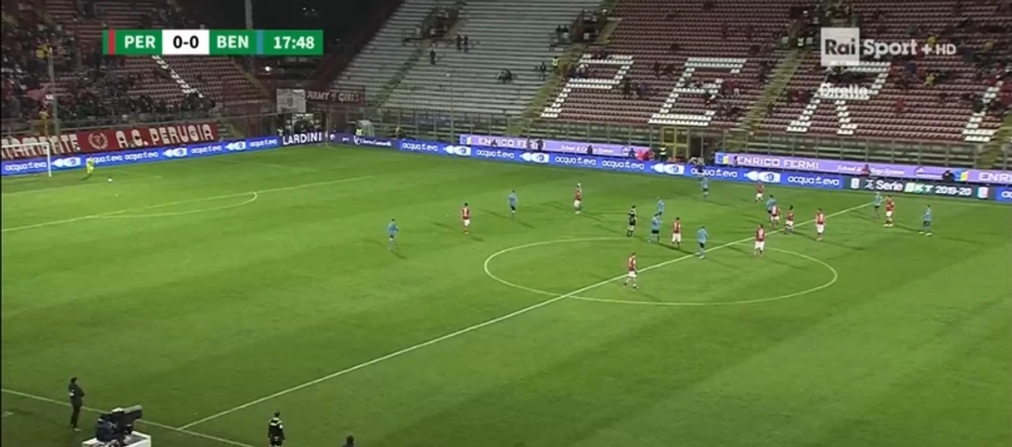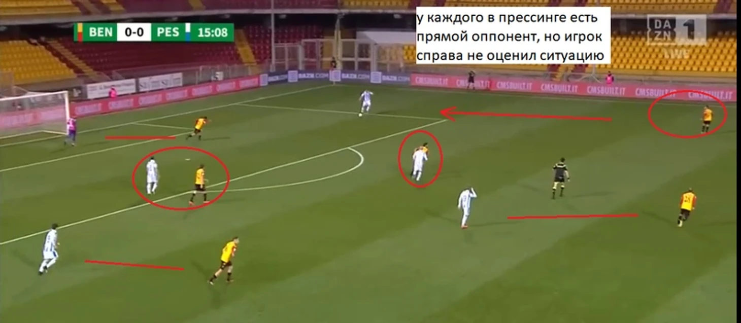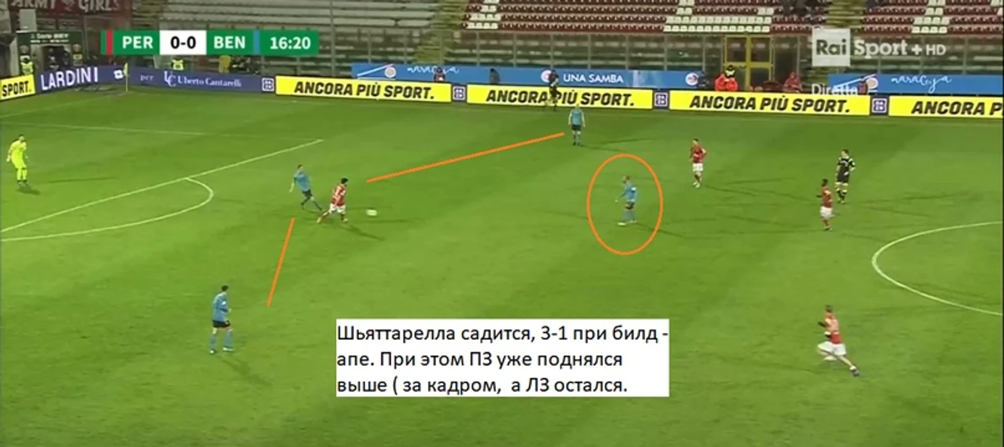 Индзаги активно заигрывает с прессингом, но не сказать, что он его использует в каждом матче. « Беневенто» не ставит во главу угла быстрый отбор; кажется, этому способствует средний возраст команды ( 29 лет ) и, вероятно, общая функциональная подготовка ( нужно быть внутри команды, чтобы понять) и общие данные игроков .Чаще « ведьмы» начинают встречать ближе к центральному полукругу, создавая там плотность. Но есть матчи, где « Беневенто» пробует прессинговать в стиле « Аталанты», но длится это недолго и, как правило, в начале матчей, особенно домашних. К сожалению, возникают вот такие моменты:
