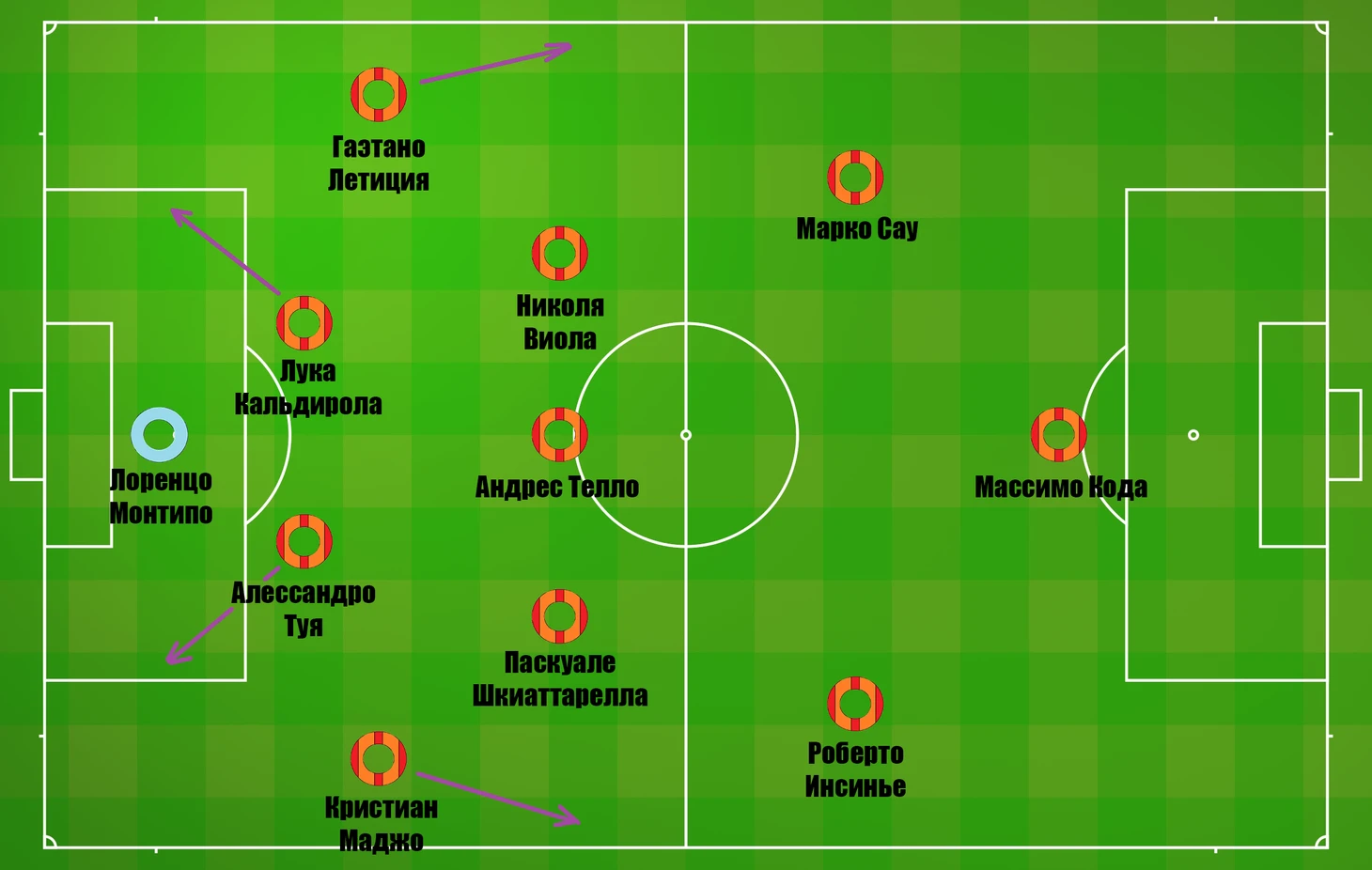 1) Акцент на левый фланг, куда стягивается Виола из опорной центральной зоны и куда выходит Инсинье или Сау. Оба действуют без привязок к конкретной позиции. Далее идет подача от Виолы или от забегающего Летиции (4 ассиста за сезон).