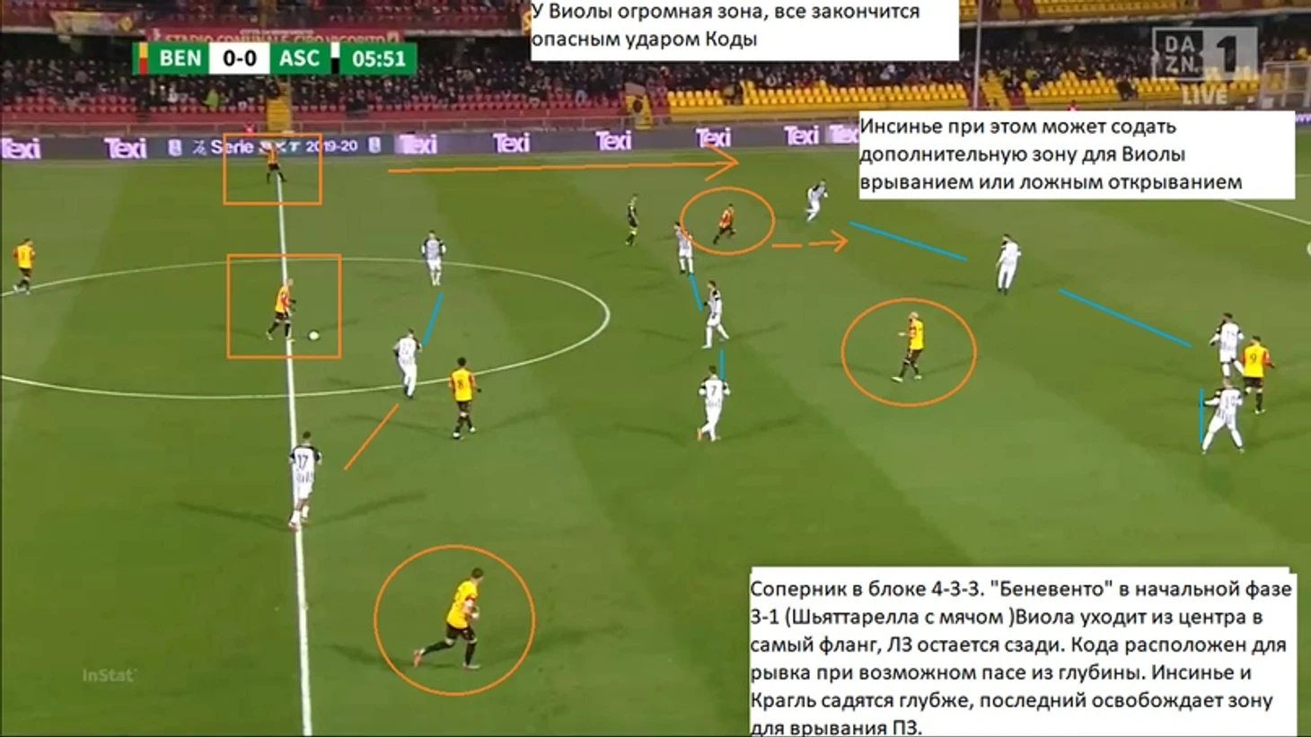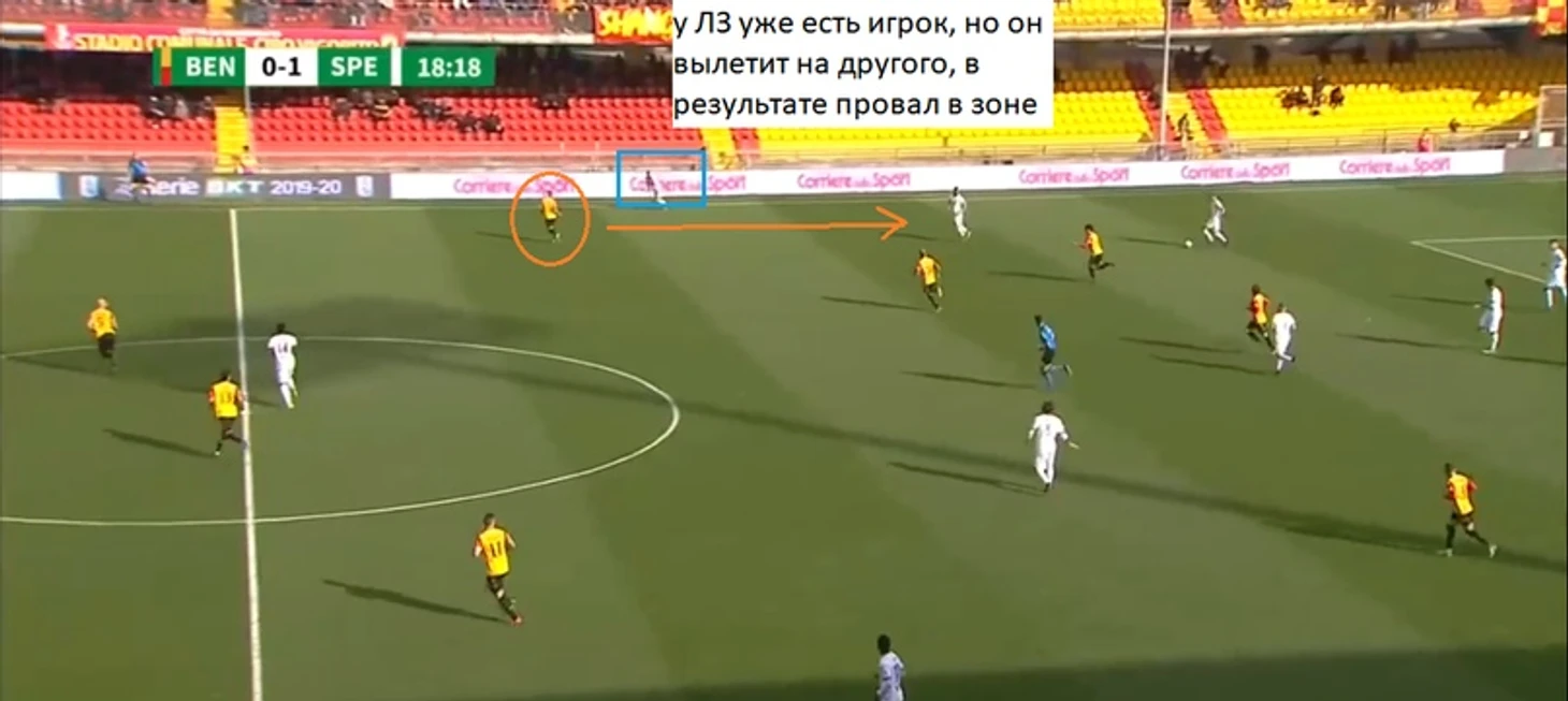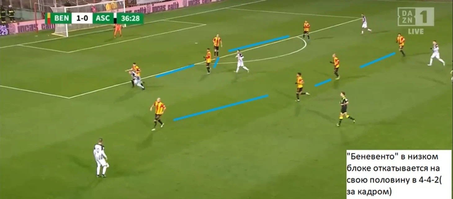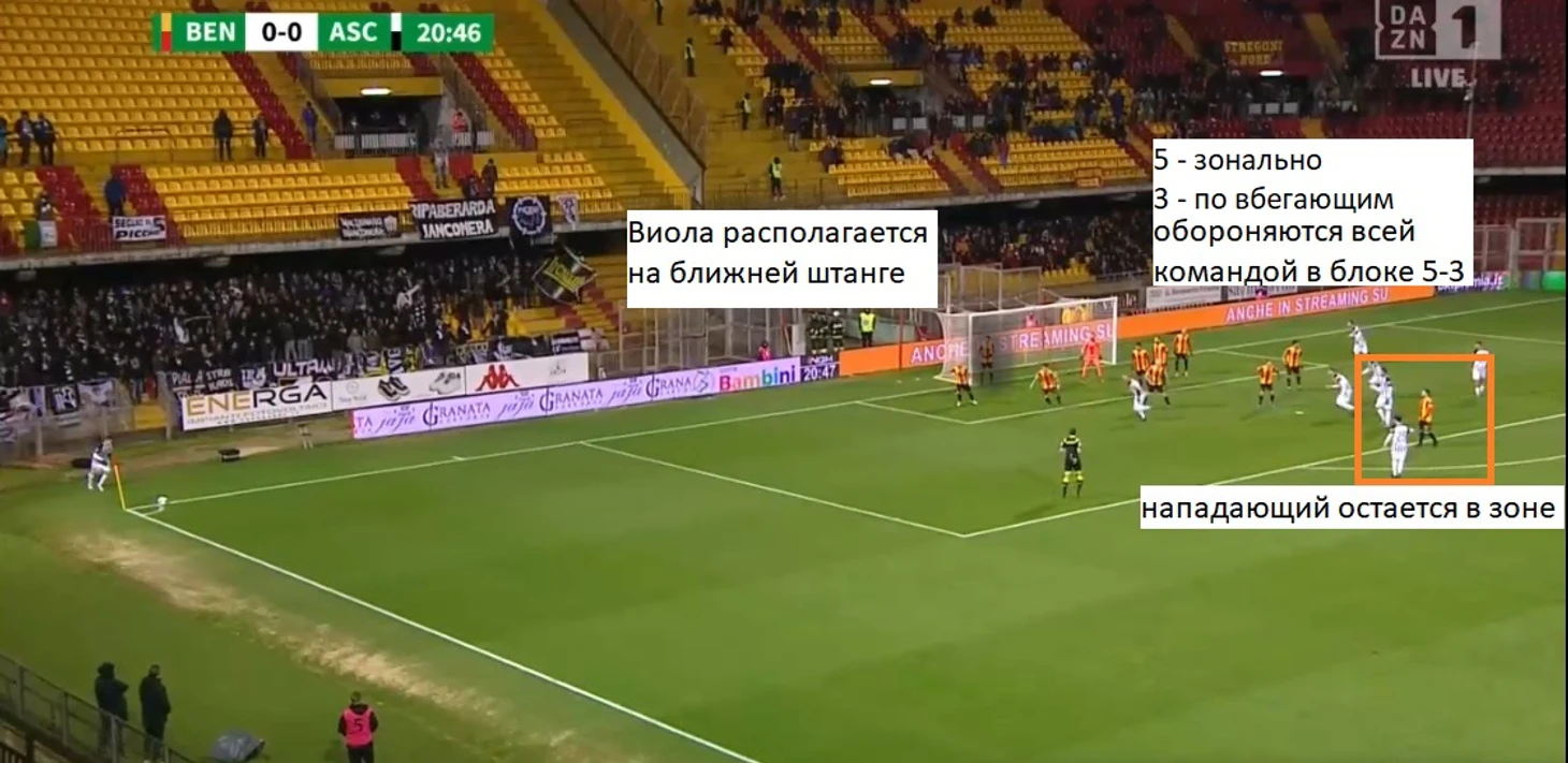 Интересно, что при чужих угловых « Беневенто» ставит игрока на ближнюю штангу, чаще это Виола (или Маджо), который, к примеру, спас команду таким образом в матче с «Асколи». Вся остальная команда действует в зональном блоке 5-3-1, где тройка реагирует на забегания. стоит добавить, что за последние 10 матчей « Беневенто» ни разу не пропустило с угловых: