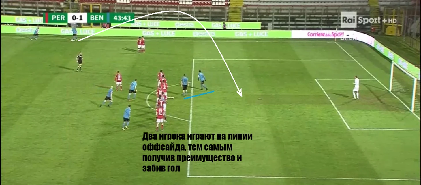 Если мы будем рассматривать штрафные, то здесь есть одна особенность — « Беневенто» оставляет двух игроков в офсайде, но они не делают блокировку для остальных вбегающих. Деморализует ли это соперника, сказать сложно, но, по крайней мере, один,минимум, гол так забит был ( матч с «Перуджой»):