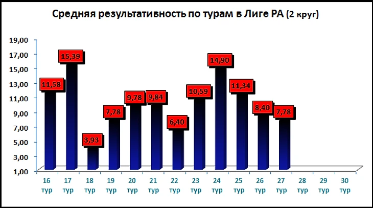 Средняя результативность 27-го тура в Лиге РА - 7,8 очка на игрока: