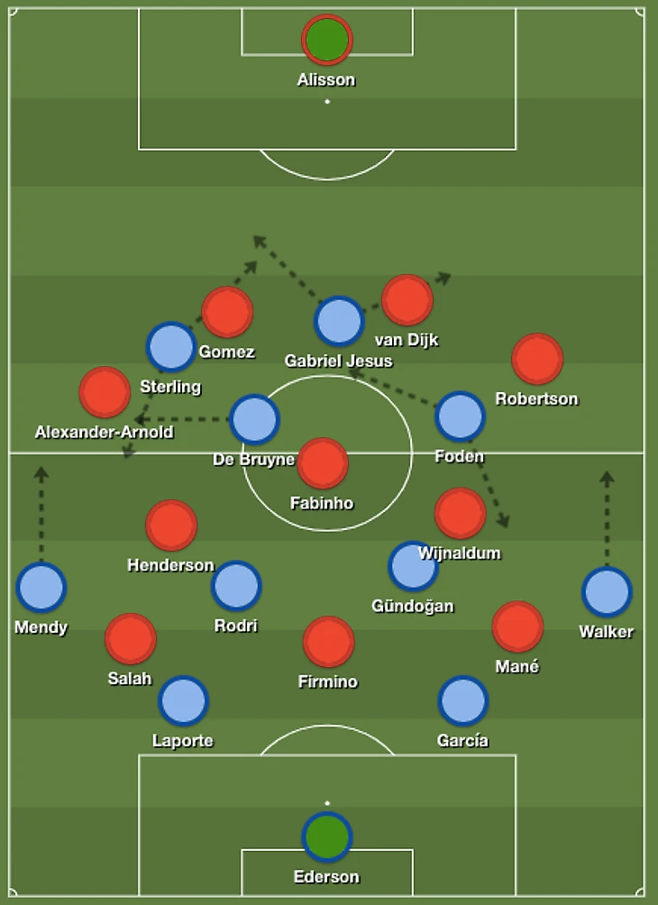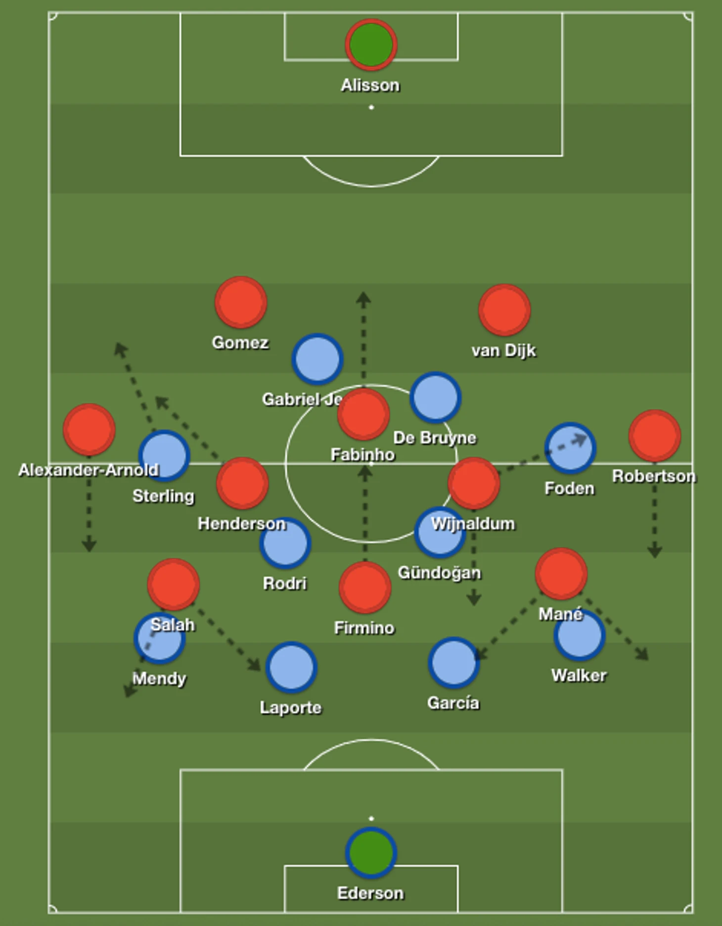 После замены Габриэля Жезуса на Рияда Мареза, Стерлинг переместился на позицию нападающего, Фоден занял бывшую позицию Стерлинга слева, а Рияд Марез разместился справа. Клопп тоже сделал несколько замен до гола - Наби Кейта и Дивок Ориги заменили Вейналдума и Фирмино соответственнo