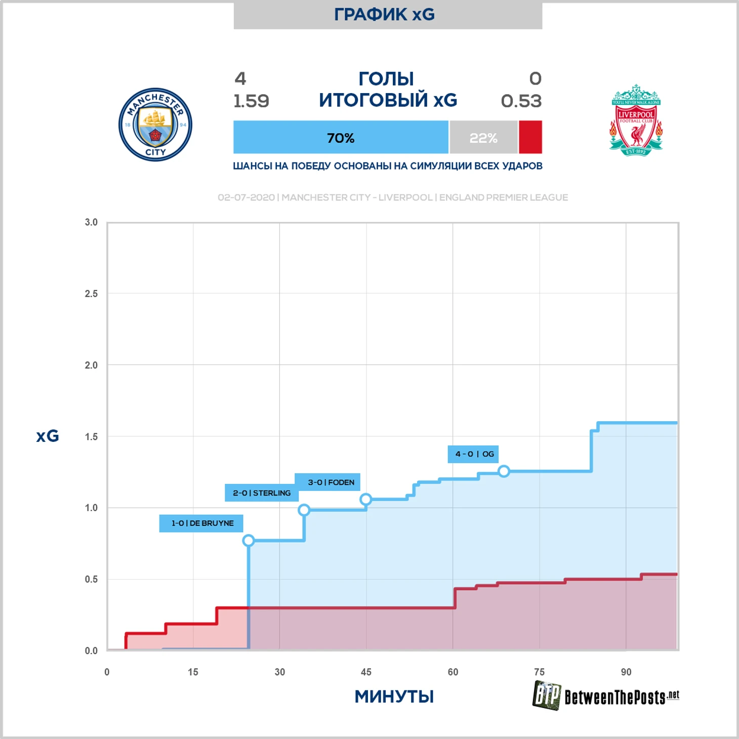 Но, если быть честными, то нужно признать что в матче не было ни одного отрезка, в котором было видно хотя бы намёк на возвращение Ливерпуля в строй, и в целом их усилия с течением времени сошли на нет. Эти процессы ускорил четвёртый гол Сити, забитый на 66-й минуте. Окслейду-Чемберлену не повезло срезать мяч в собственные ворота, когда он пытался заблокировать своим подкатом удар Стерлинга из пределов штрафной.
