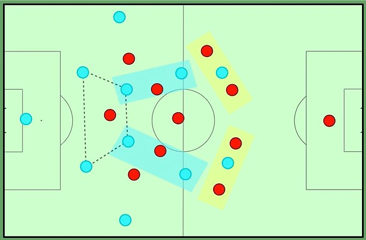 Более того, факт наличия двух игроков перед полузащитой соперника, и ещё двух - сзади неё, создаёт угрозу возможных кризисов принятия решений для игроков полузащиты Ливерпуля: