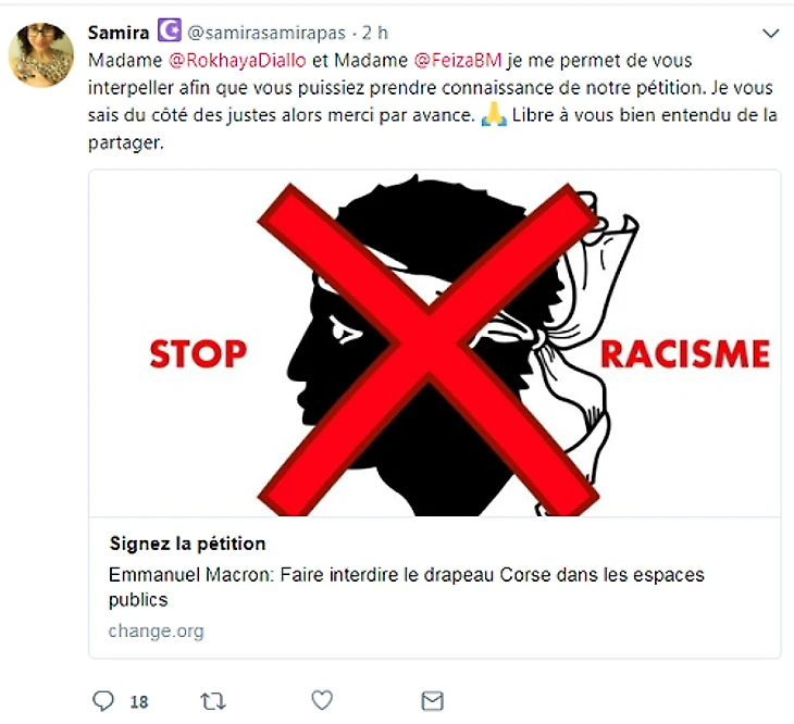 Французские медиа тогда для иллюстрации цитировали противницу флага по имени Самира, рассуждала она так: «Я с ужасом узнала, что на корсиканском флаге голова мавра! Иными словами, это обезглавленный араб! Как можно выставлять такую жуть в качестве символа французского департамента?»