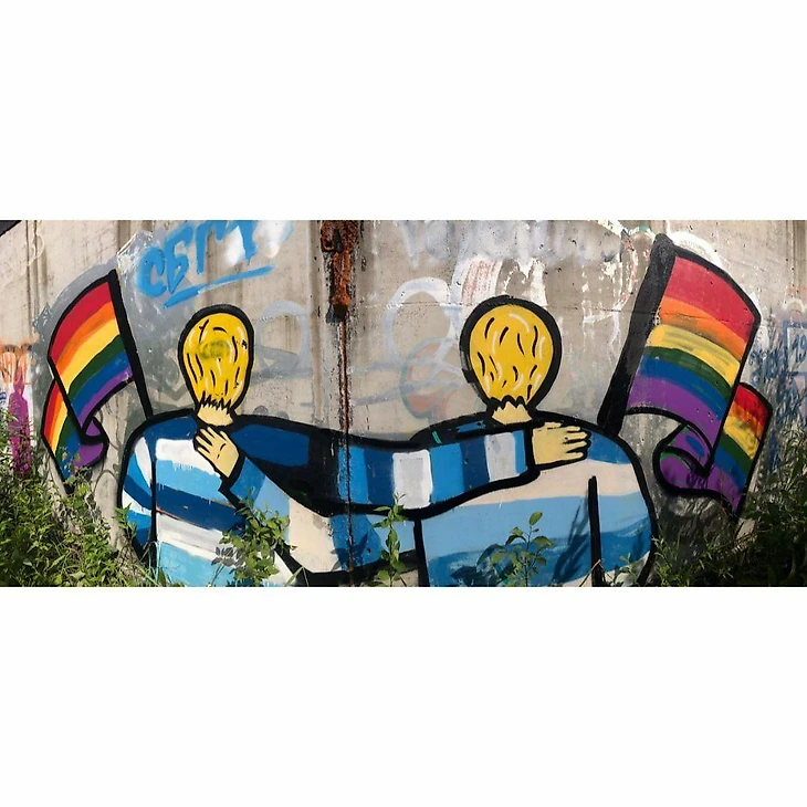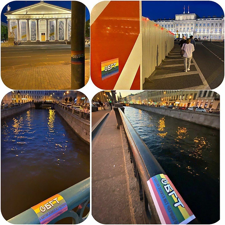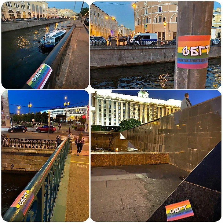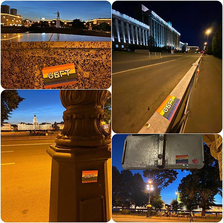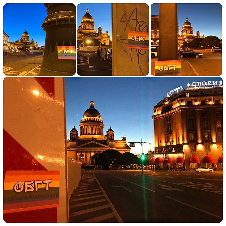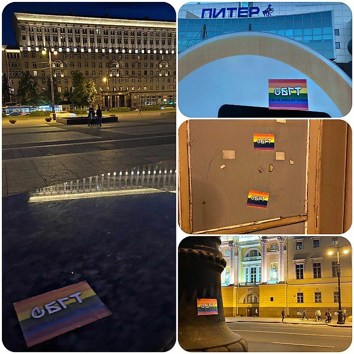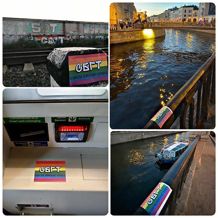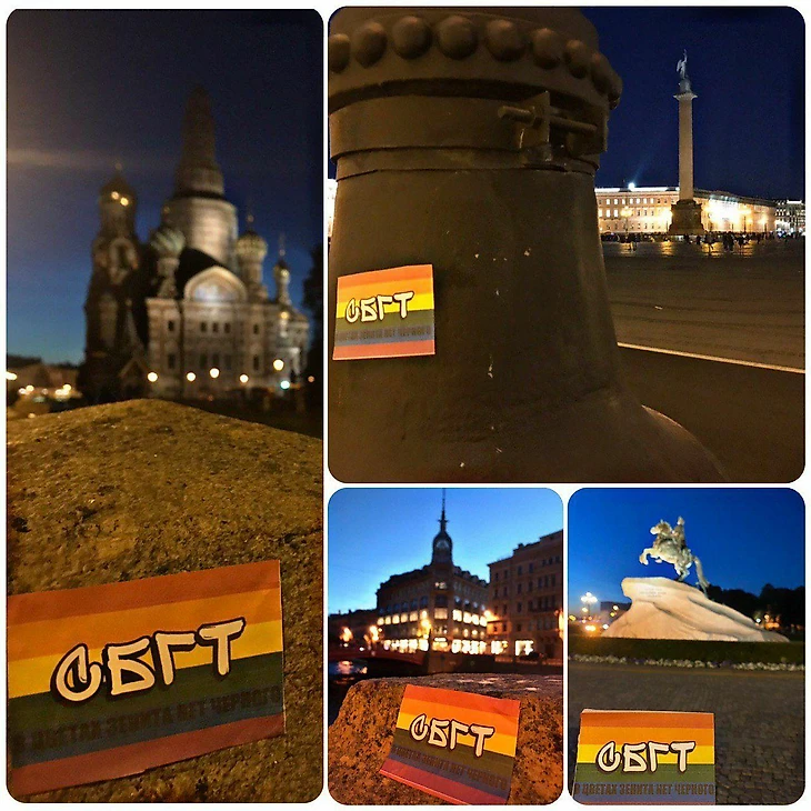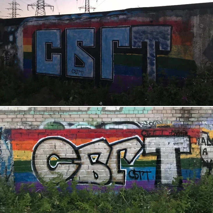Спартаковцы нарисовали два граффити и расклеили по городу много стикеров, в которых скрестили две аббревиатуры – «сбг» (сине-бело-голубые) и «лгбт» (лесбиянки-геи-бисексуалы-трансгендеры). И граффити, и стикеры были выполнены в радужных цветах.