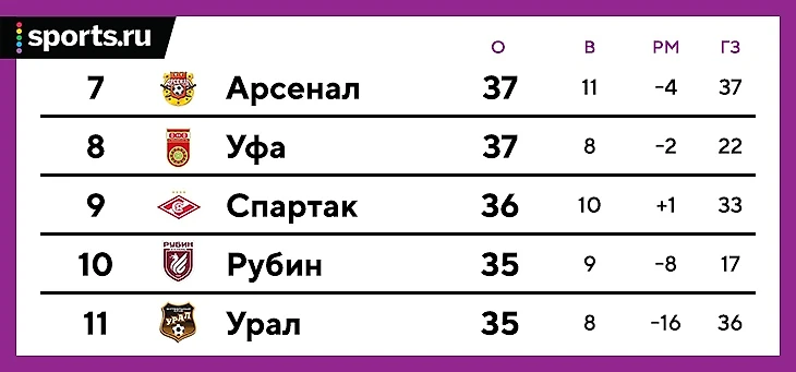 • Сражение «Спартака» с антирекордом: москвичи могут занять места в диапазоне 7-11 – и 11-я строчка будет худшим результатом в российской истории клуба, там «Спартак» окажется в случае поражения от «Рубина» и хотя бы одного очка «Урала» (играют с железно вторым «Локо»).