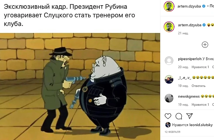С тренерами у Артема Дзюбы часто отношения интересные. С Карпиным, правда, не до шуток, сплошные угрозы. А вот с Леонидом Слуцким Дзюба просто хоть сейчас в одну команду КВН. Не так давно Слуцкий шутил на тему возможного перехода Дзюбы в «Тоттенхэм» к Моуриньо, а Артем сравнивал тренера с героем мультфильма «Тайна третьей планеты».