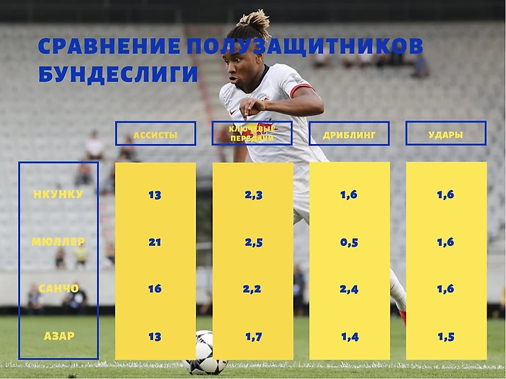 Нкунку мало в чем проигрывает двум опытным полузащитникам Бундеслиги и одному вундеркинду, однако интерес к его персоне не столь огромный, как к тому же Санчо. Также француз установил рекорд этого сезона в Чемпионате Германии. Полузащитник отдал 4 голевых паса за 28 минут в матче с «Шальке», что другим полузащитникам в этом сезоне сделать не удавалось.
