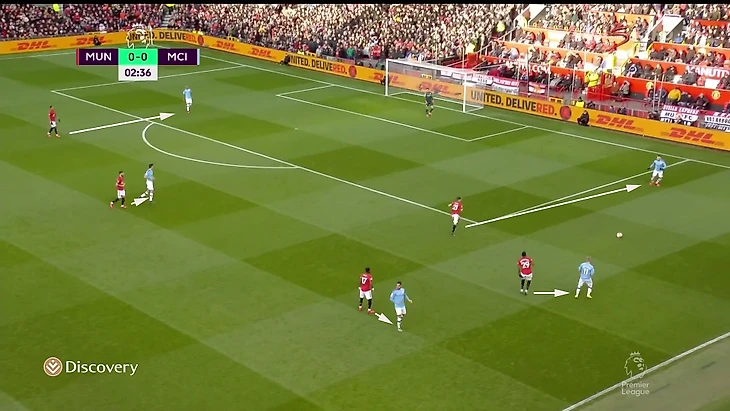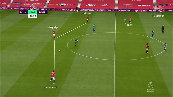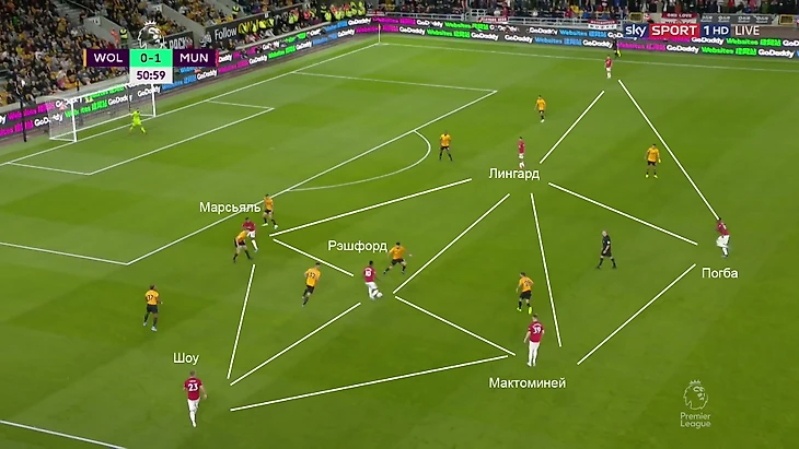 При импровизации настолько четкие расстояния и принципы не прослеживаются. Внутри системы также работают «ротации». Самая простая из них: Шоу оказался в полуфланге, значит, ширину держит Рэшфорд. Игроки дисциплинированно следовали этим указаниям.