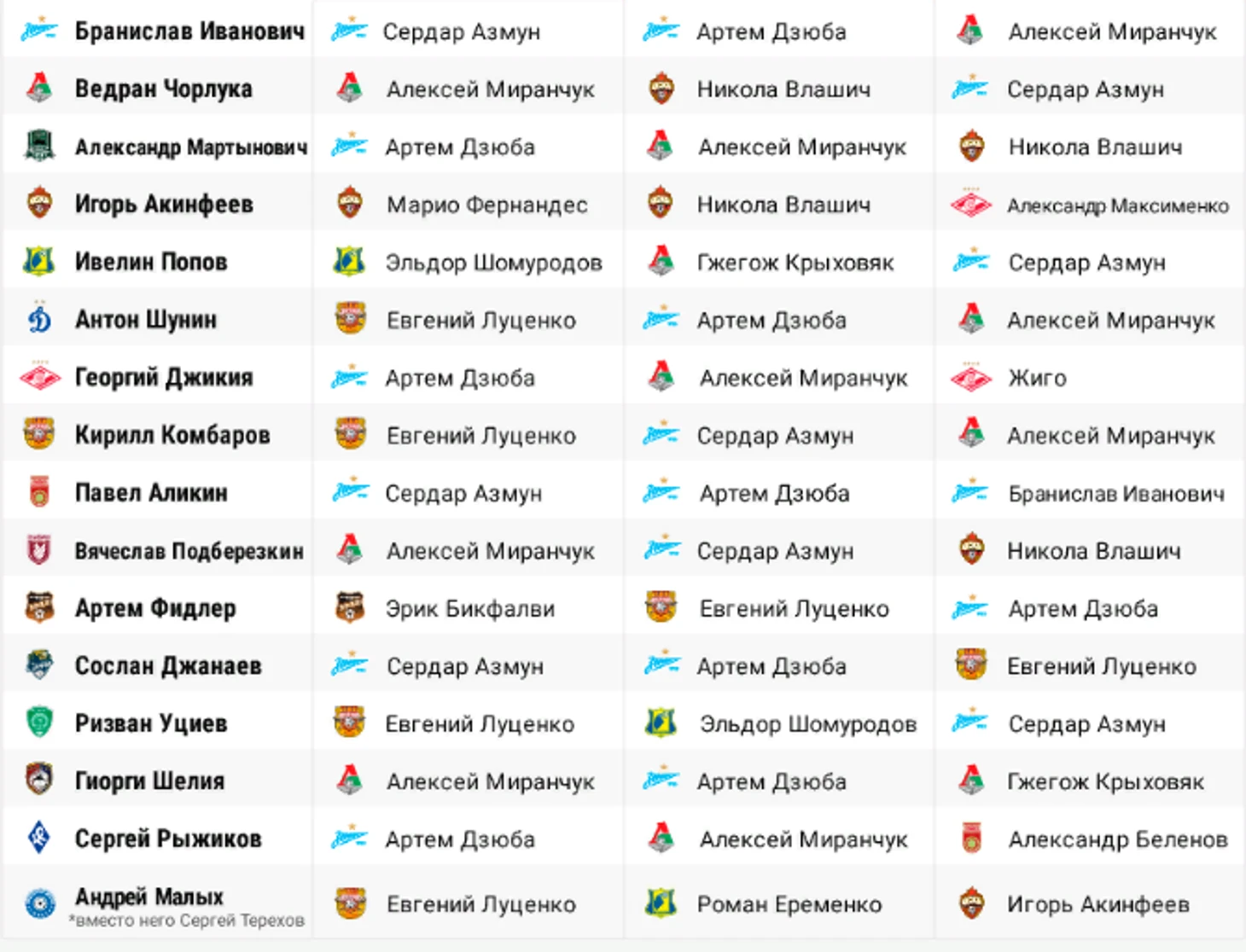 Тут многие отдавали голоса за своих партнеров или друзей , хотя были и интересные моменты например Игорь Акинфеев в топ-3 включил Александра Максименко , Джикия выбрал Жиго на третье место, а Сергей Рыжиков включил Александра Беленова в тройку лучших.В итоге ,как я уже писала выше Лучшим признан Дзюба по версии главных тренеров РПЛ ,так же и по версии капитанов клубов РПЛ.